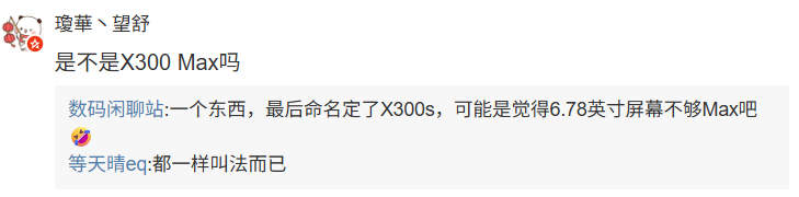 值得一提的是,该博主在评论区透露,vivo X300s 并未采取 X300 Max 的命名,“可能是觉得 6.78 英寸屏幕不够 Max 吧”。