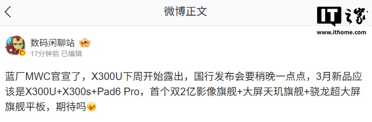 IT之家 2 月 28 日消息,vivo X300 Ultra 下周将在巴塞罗那 MWC 2026 首次亮相,定位影像旗舰。博主 @数码闲聊站 今日透露“国行发布会要稍晚一点点”,并曝光了 vivo 三月新品阵容。