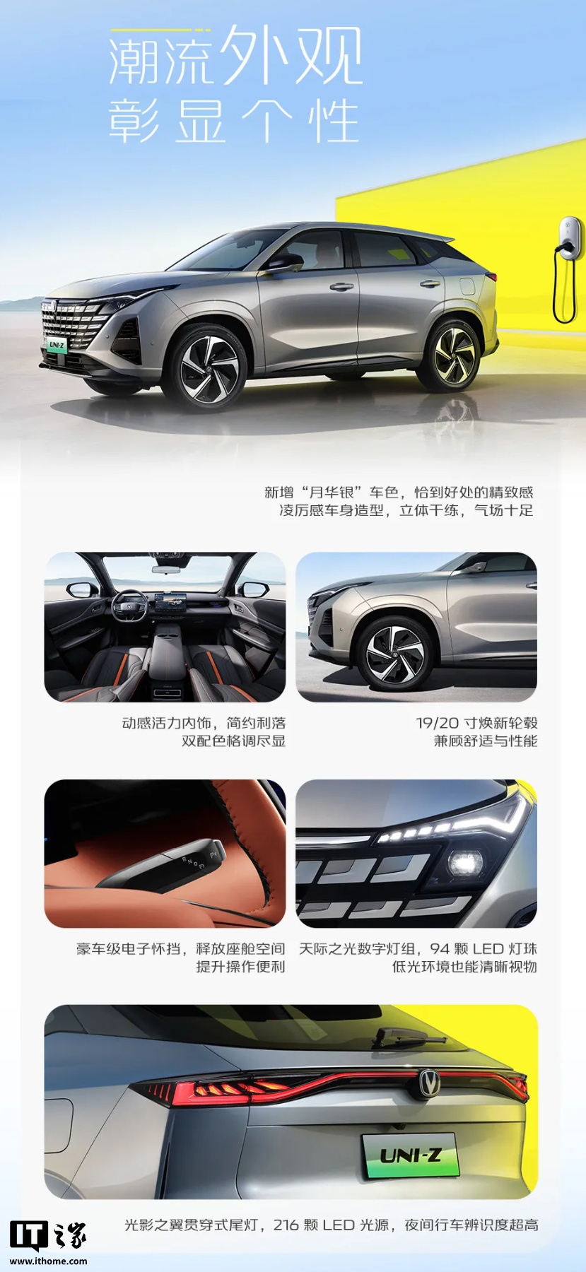 2026 款长安 UNI-Z PHEV 新增“月华银”车色,尺寸为 4730*1890*1680mm,轴距 2795mm,配有电子怀档、贯穿式尾灯。