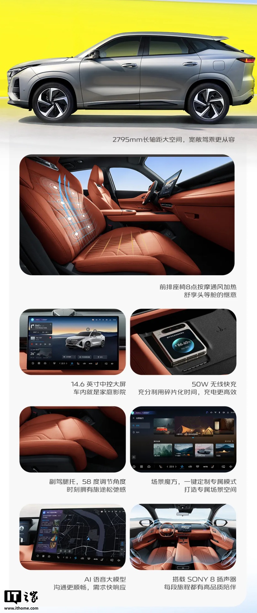 该车顶配搭载 8 扬声器索尼音响(IT之家注:其余为 6 扬声器)、氛围灯、副驾座椅按摩,中高配搭载前排双层隔音玻璃、主副驾座椅通风加热、主驾座椅按摩,标配可开启全景天窗、主驾座椅电动 6 向调节。