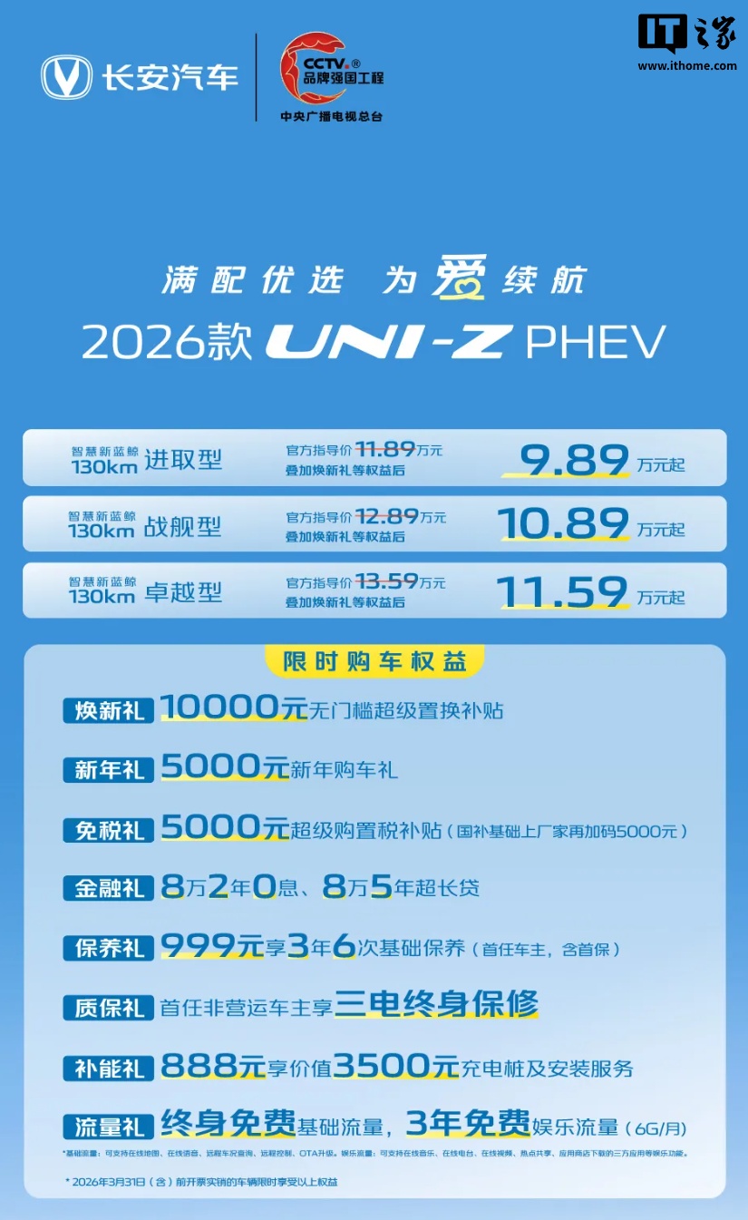 IT之家 2 月 28 日消息,2026 款长安 UNI-Z PHEV 汽车今日正式发布,这是一款插混 SUV 车型,官方指导价 11.89 万元起,叠加置换补贴等权益后 9.89 万元起。