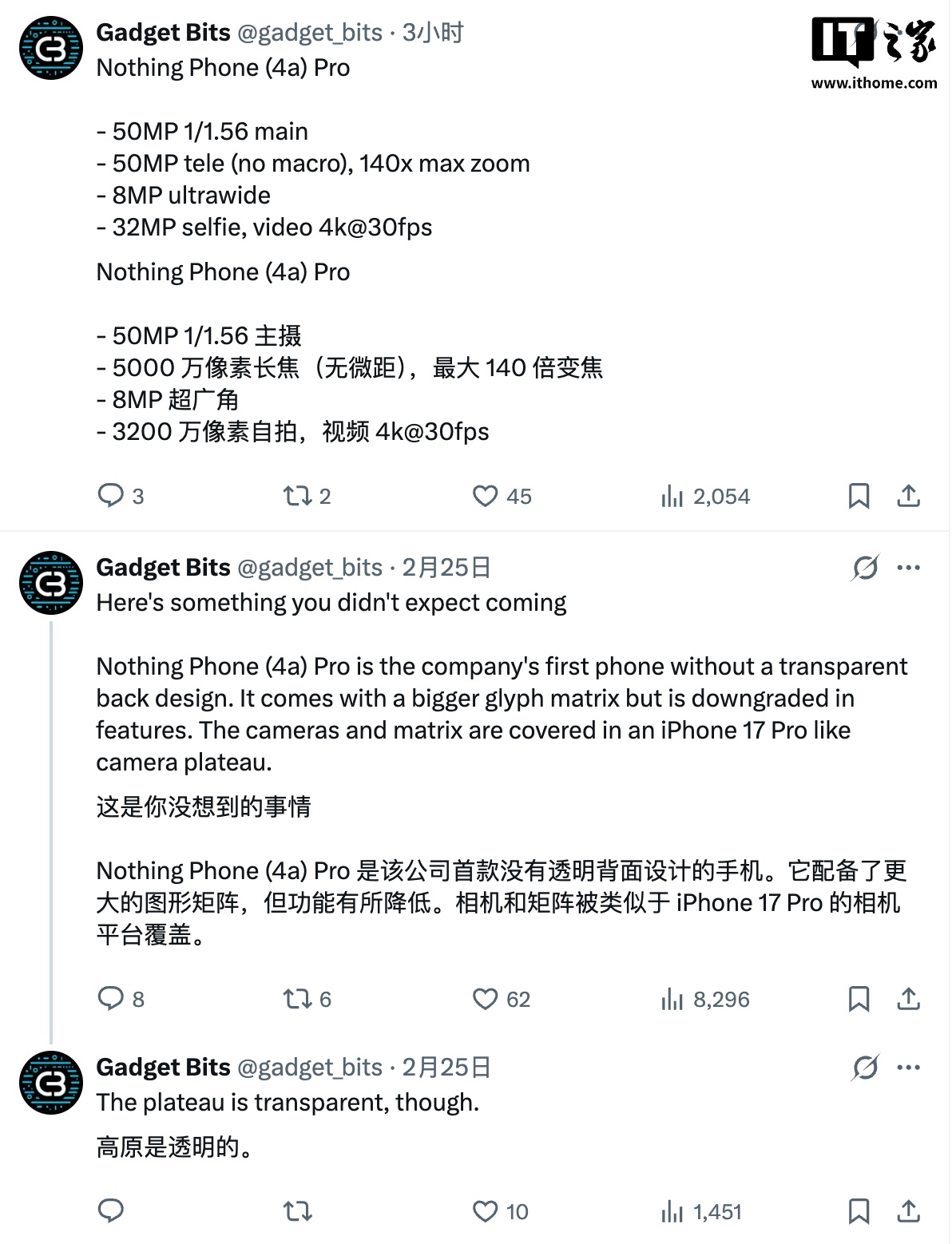 IT之家 2 月 28 日消息,距离 Nothing 定于 3 月 5 日举行的“Built Different”发布会仅剩数日,今天下午,X 博主 @gadget_bits 曝光了 Nothing Phone (4a) Pro 的多项细节。