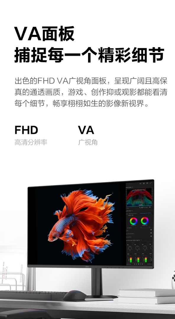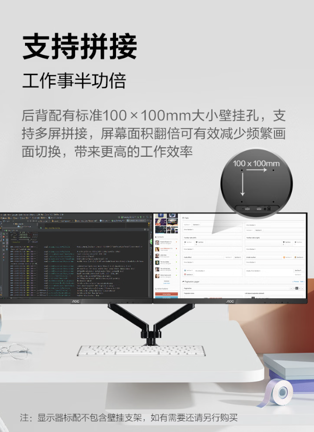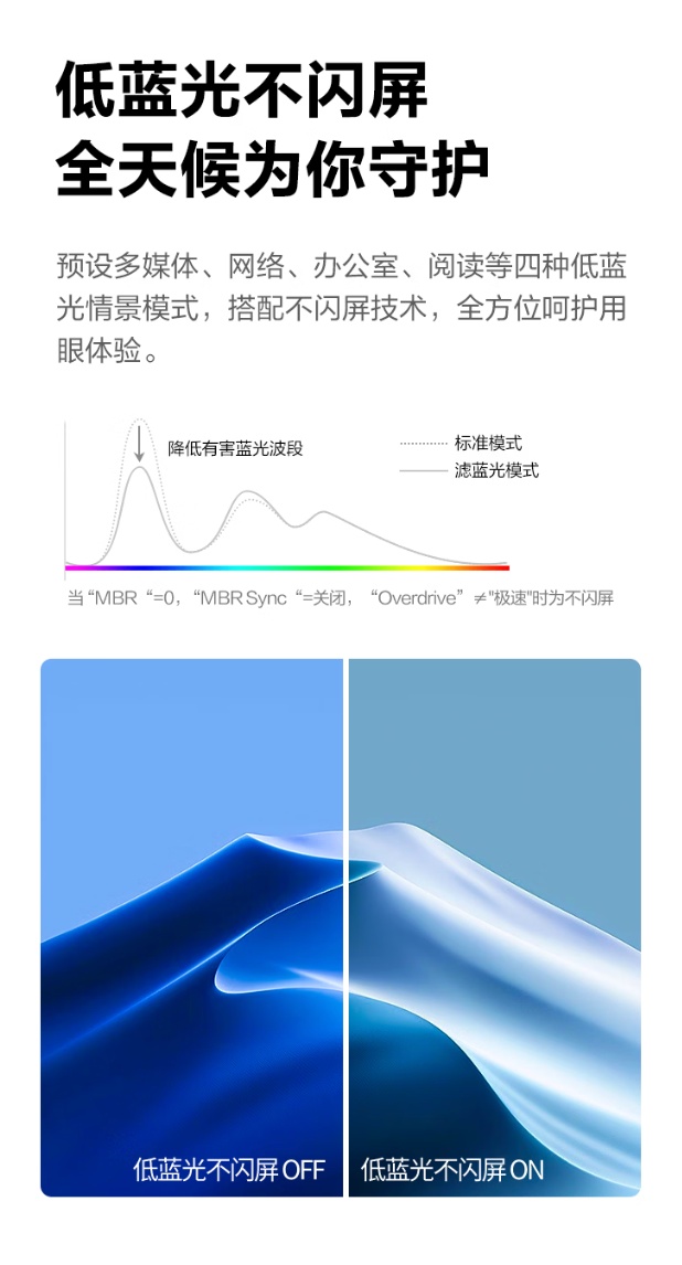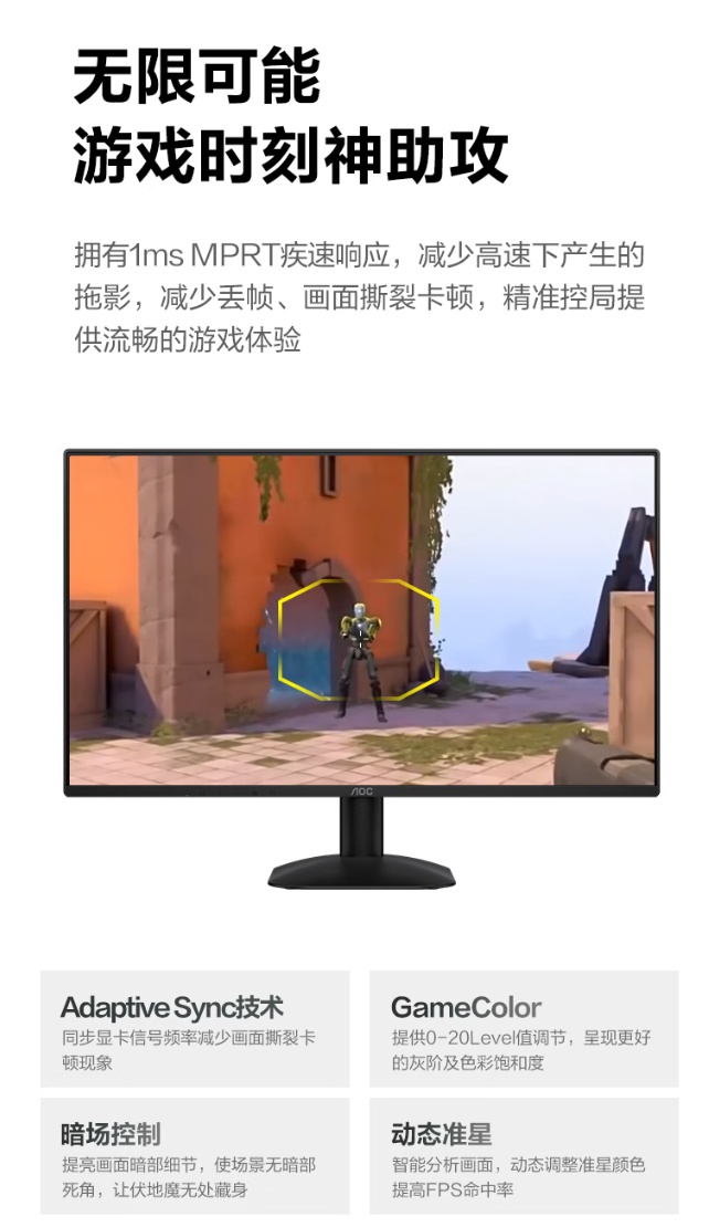 规格方面,这款显示器支持 Adaptive Sync 技术,可减少画面卡顿、撕裂现象发生,支持暗场控制、动态准星等游戏功能,带有多媒体、网络、办公室和阅读四种低蓝光情景模式,后背带有标准 100*100mm 大小壁挂孔,支持多屏拼接。