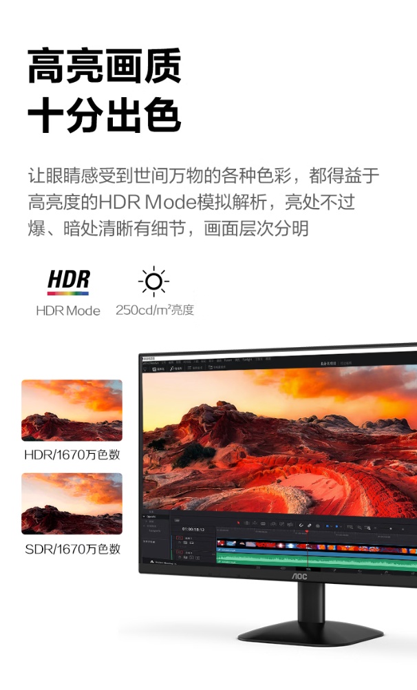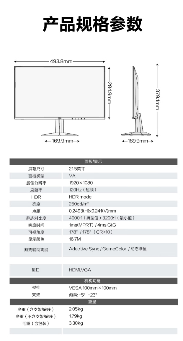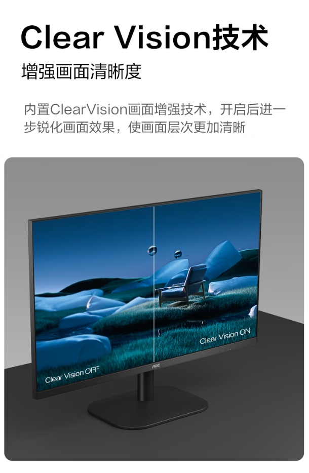据介绍,这款显示器的分辨率是 Full HD(1920*1080),支持 120Hz 高刷,MPRT 响应时间为 1ms,内置 VA 广视角面板,最高亮度可达 250cd/m2,支持 HDR 模式,色深为 8 bit(1670 万色),内置 Clear Vision 技术,可增强画面清晰度。