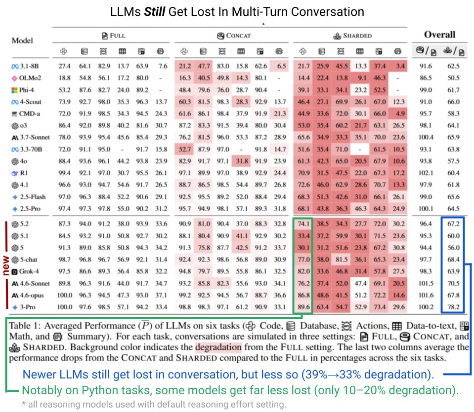 IT之家 3 月 1 日消息,据 THE DECODER 报道,新一代大语言模型(从 GPT-5 及后续版本开始)在任务需要跨多轮对话完成时,表现依然不佳。研究员菲利普 · 拉班(Philippe Laban)及其团队在代码、数据库、操作指令、数据转文本、数学计算、文本摘要这六大任务上对现有模型进行了测试。当信息被拆分到多条消息中(分片式),而非集中在单次提示词里(拼接式)时,模型性能会显著下降。