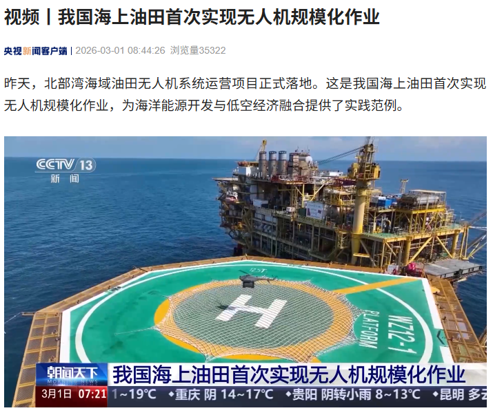IT之家 3 月 1 日消息,据央视新闻报道,昨天,北部湾海域油田无人机系统运营项目正式落地。这是我国海上油田首次实现无人机规模化作业,为海洋能源开发与低空经济融合提供了实践范例。