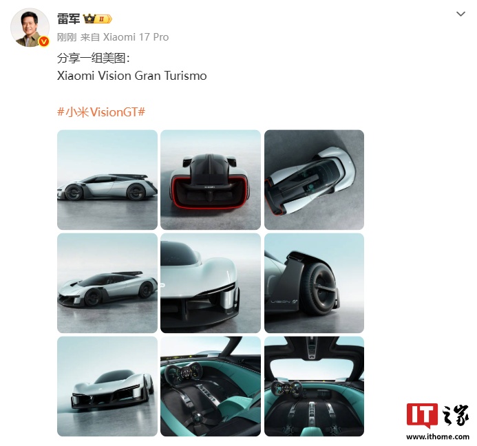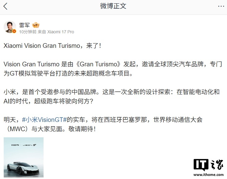 据IT之家今日早些时候报道,雷军还发文称,明天,小米 Vision GT 的实车,将在西班牙巴塞罗那世界移动通信大会(MWC)与大家见面。