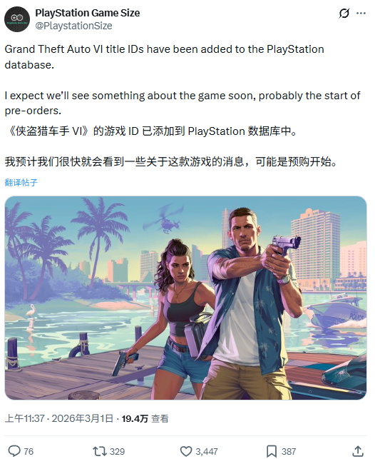 对于翘首以盼的粉丝们来说,等待虽然煎熬,但终点线似乎已越来越近。专注追踪 PlayStation 商店数据的“PlayStation Game Size”发现,PlayStation 商店新加入了《GTA 6》的“标题 ID”(title IDs),这通常被视为预购开启前的最后几个步骤之一。