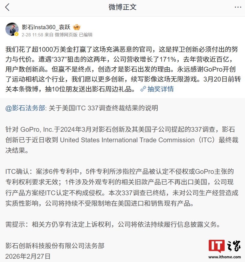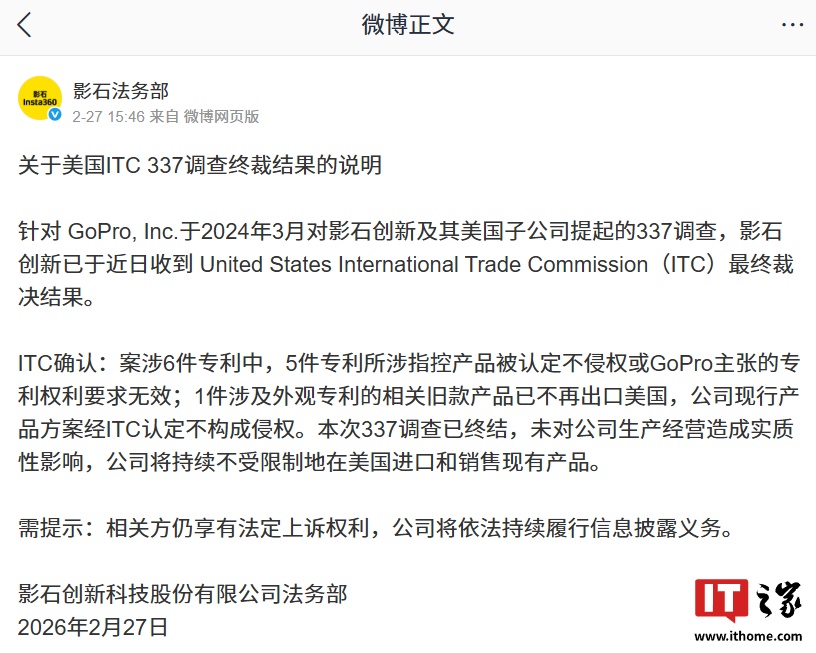 IT之家 3 月 1 日消息,影石法务部 2 月 27 日发布说明,公布了针对 GoPro, Inc.于 2024 年 3 月对影石创新及其美国子公司提起的 337 调查最终裁决结果:影石创新 337 调查终裁完胜,GoPro 六项指控均不成立,公司将持续不受限制在美销售现有产品。