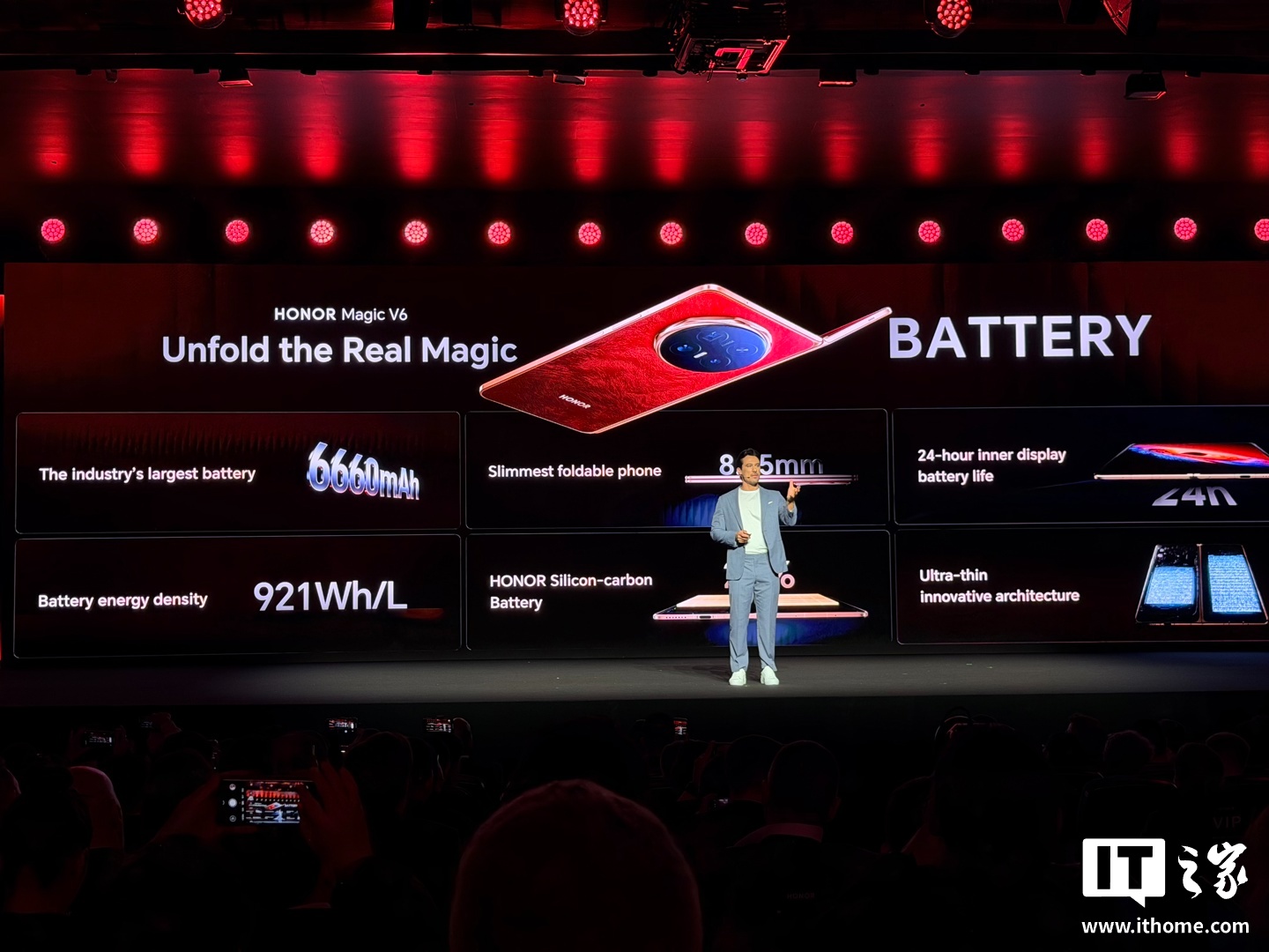 荣耀 Magic V6 将采用硅碳刀片电池技术(硅含量 32%,能量密度高达 921Wh/L),内置 6660mAh 超大电池,续航远超 iPad Air 与 MacBook Air,支持 24 小时连续使用(内屏)。