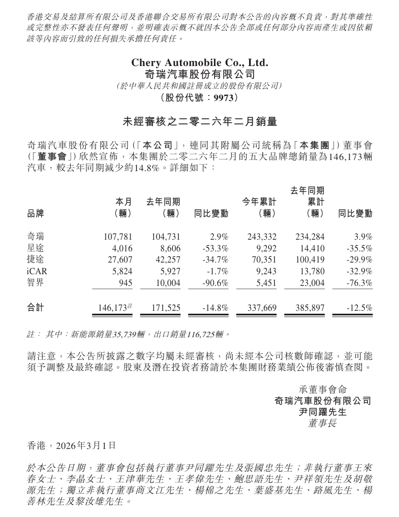 IT之家 3 月 2 日消息,奇瑞汽车昨日发布《未经审核之二零二六年二月销量》公告,其中提到五大品牌总销量为 146,173 辆,较去年同期减少约 14.8%。