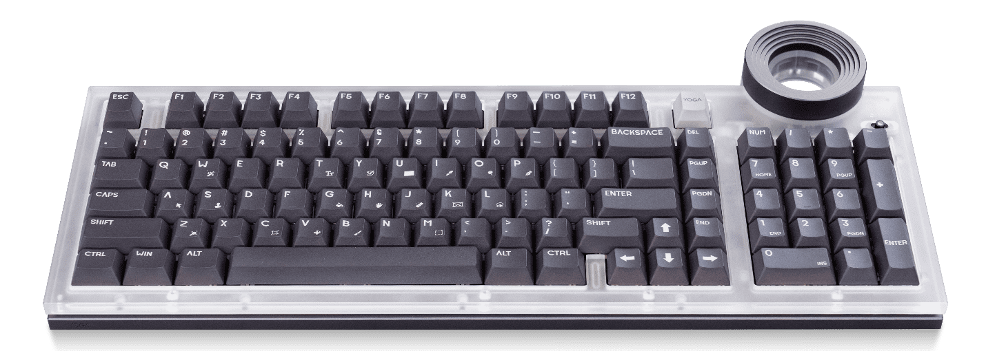 Yoga 创意键盘怒喵版最为标志性的设计莫过于其右上角的星环结构,内容创作可利用该旋钮轻松控制编辑软件的播放头,体验比鼠标更为直接清晰的触觉反馈。对于联想 Yoga 生态系统用户,这款键盘还配备了专用 Yoga 按键,可在笔记本与显示器间切换音频输出,也可将音频同步到两个设备的全部扬声器。