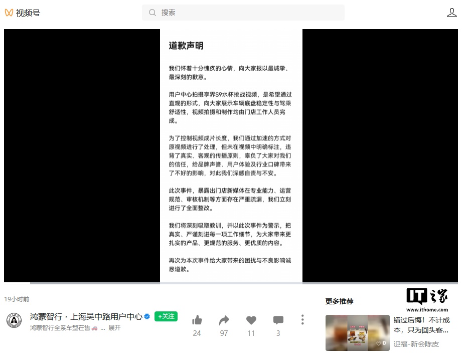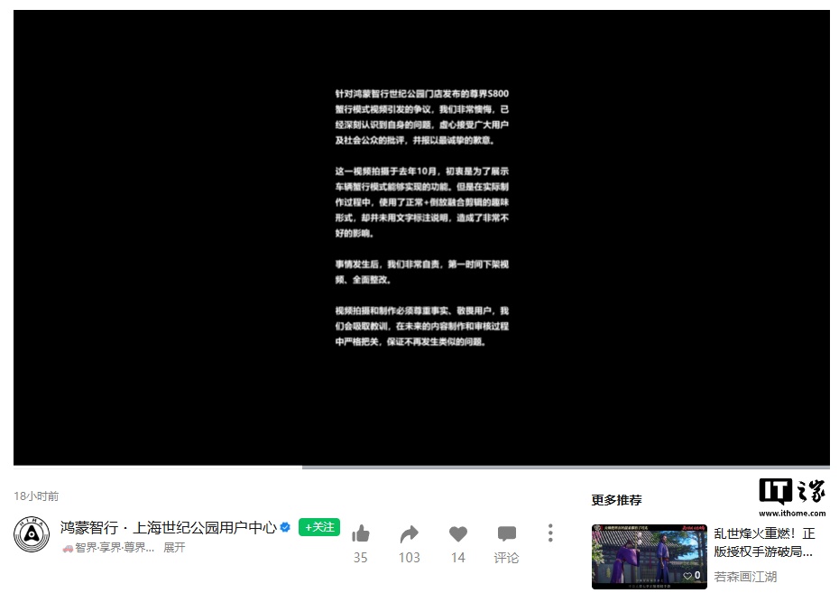 IT之家查询获悉,“新黄河”此前的报道披露称,部分鸿蒙智行区域门店账号在网络平台发布营销视频时,使用加速或倒放视频素材、违规营销。