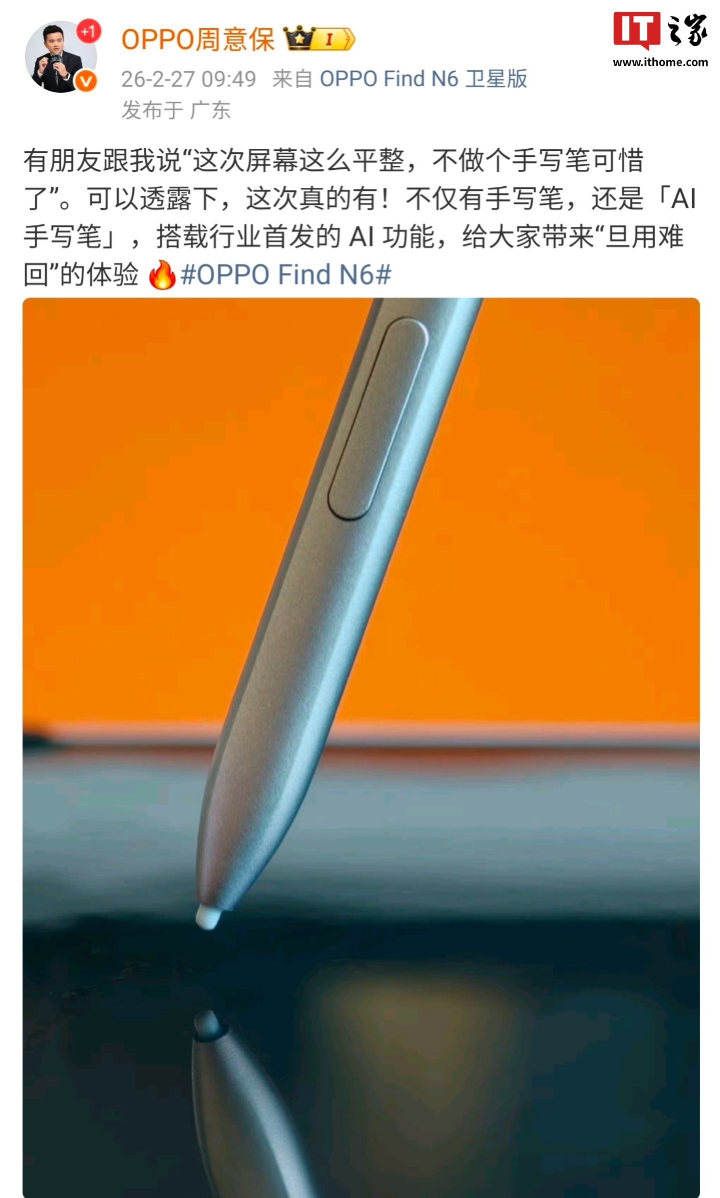 另外,OPPO Find 系列产品负责人周意保还透露,OPPO Find N6 不仅有手写笔,还是“AI 手写笔”,搭载行业首发的 AI 功能,给大家带来“旦用难回”的体验。
