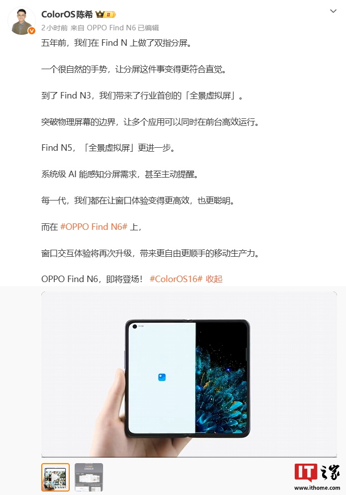 IT之家 3 月 2 日消息,OPPO ColorOS 设计总监陈希今日发文,回顾了 Find N 系列手机在窗口交互方面的创新: