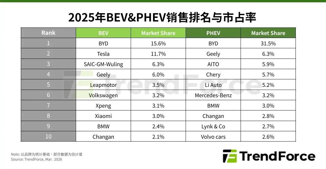 该机构统计的 2025 年纯电、插混车型排名与市场份额如下表: