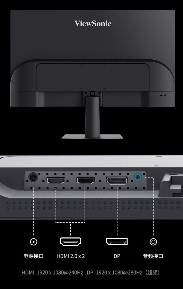该机支架支持俯仰,显示器本体支持 VESA 75x75mm 壁挂,提供 2 个 HDMI 2.0(240Hz)、1 个 DP 1.4(280Hz)、1 个 3.5mm 音频接口。