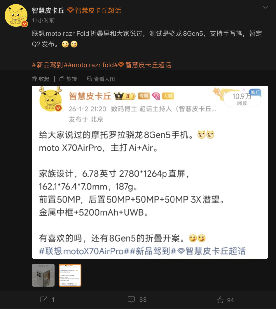 IT之家 3 月 2 日消息,联想今天官宣旗下首款大折叠 —— 联想 moto razr fold 国行即将上市,不过并未透露具体上市时间。而博主 @智慧皮卡丘 透露该机国行暂定第二季度发布,支持手写笔。