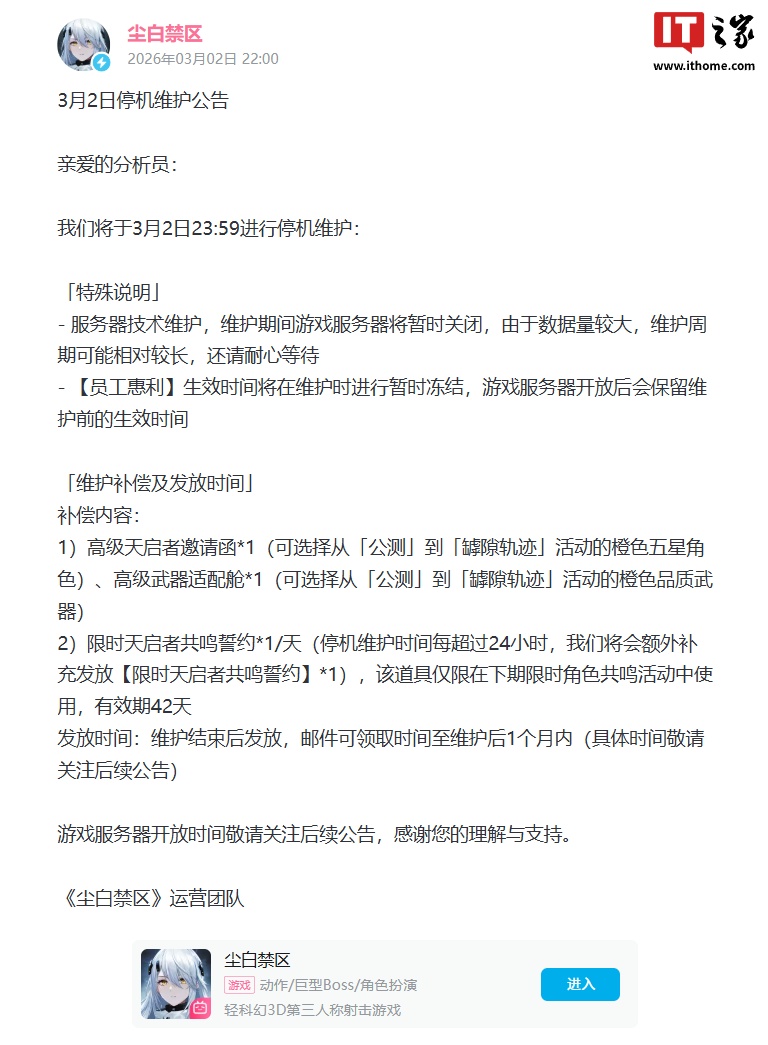 IT之家 3 月 3 日消息,西山居《尘白禁区》昨晚发布停机维护公告,宣布本作在 3 月 2 日 23:59 进行停机维护: