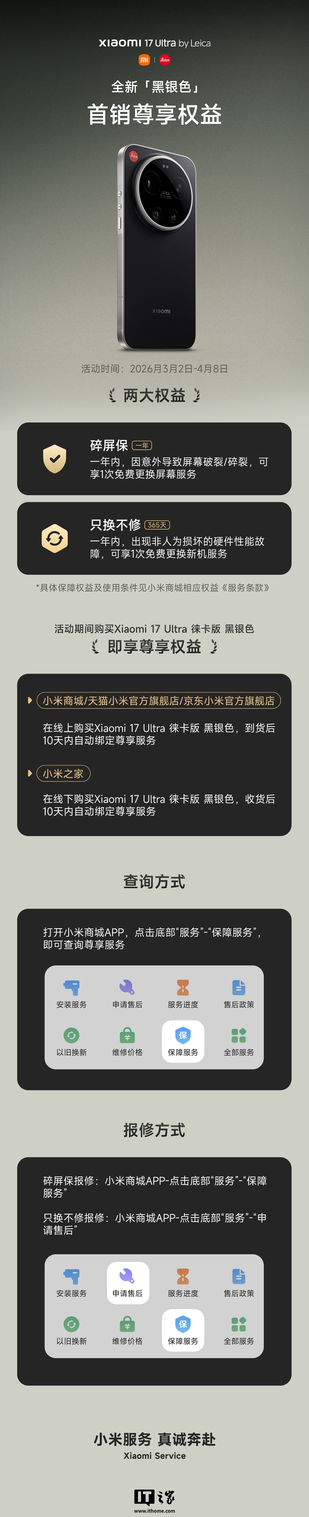IT之家 3 月 3 日消息,小米手机官方今日公开了小米 17 Ultra 徕卡版全新「黑银色」首销购机权益:一年碎屏保 + 365 天只换不修(活动时间:2026 年 3 月 2 日 - 4 月 8 日)。