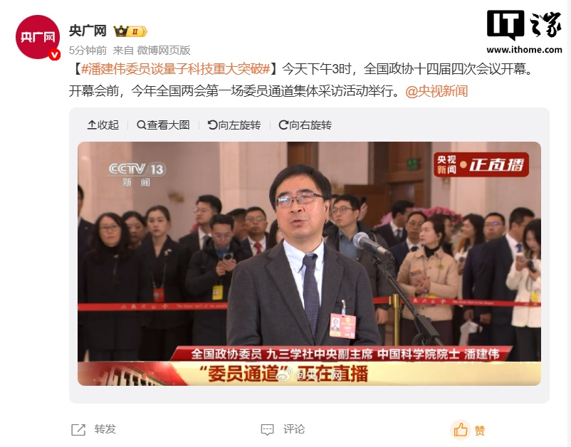 IT之家 3 月 4 日消息,据央视新闻报道,今天(3 月 4 日)下午,全国政协十四届四次会议首场“委员通道”在人民大会堂举行,全国政协委员、九三学社中央副主席、中国科学院院士潘建伟接受了记者采访。