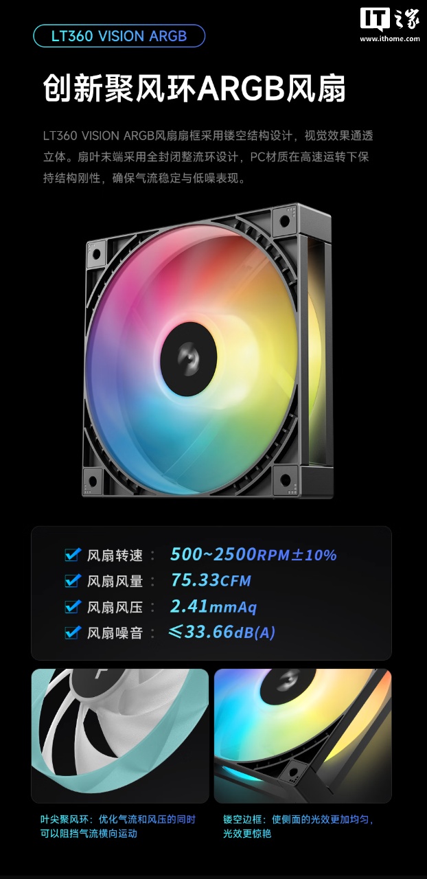 该水冷散热器采用自研第 6 代 PWM 水泵方案 / 全铝冷排;标配聚风环 ARGB 风扇,其转速设定为风扇转速设定在 500~2500 RPM ± 10%,最大风量 / 风压分别可达 75.33 CFM 和 2.41 mmAq,噪音值≤33.66dB(A)。
