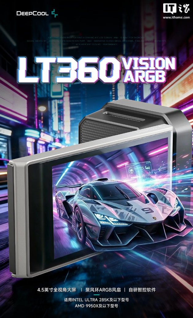 IT之家 3 月 4 日消息,九州风神现已在京东上架 LT360 VISION 一体式水冷散热器,该散热器配备一块 4.5 英寸全视角显示面板,定价为 699 元。