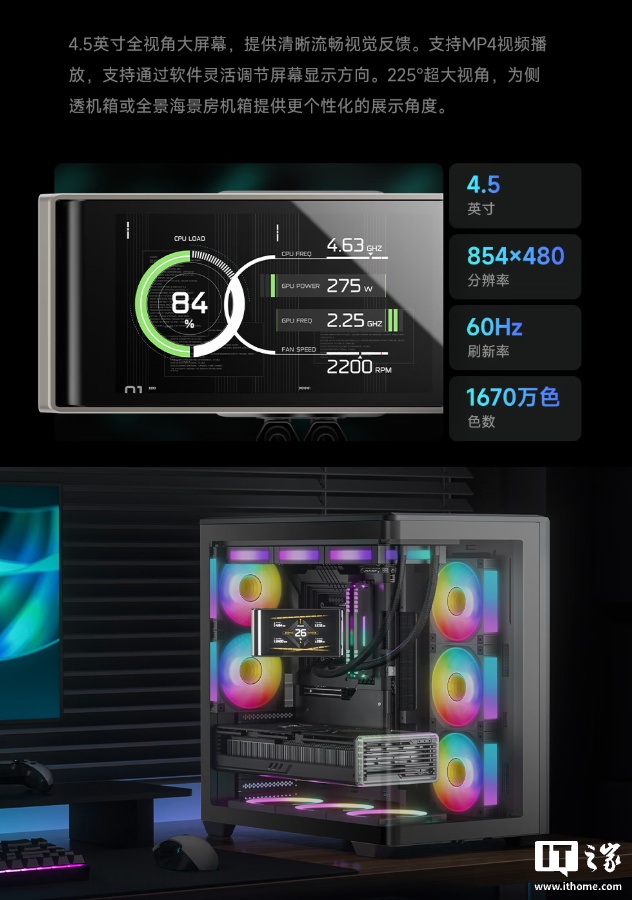 官方强调该水冷散热器冷头屏幕安装在阻尼铰链上,支持多角度调节,可倾斜度达 90 度,实现全视野无死角展示动态内容,面板具体规格为 854x480 分辨率 60Hz,支持播放 MP4 视频等个性化内容。
