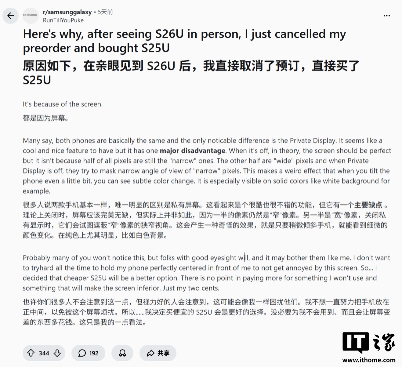 网友 u/gorginos 也分享了使用体验,认为 Galaxy S26 Ultra 的屏幕要比 Galaxy S25 系列偏暗。