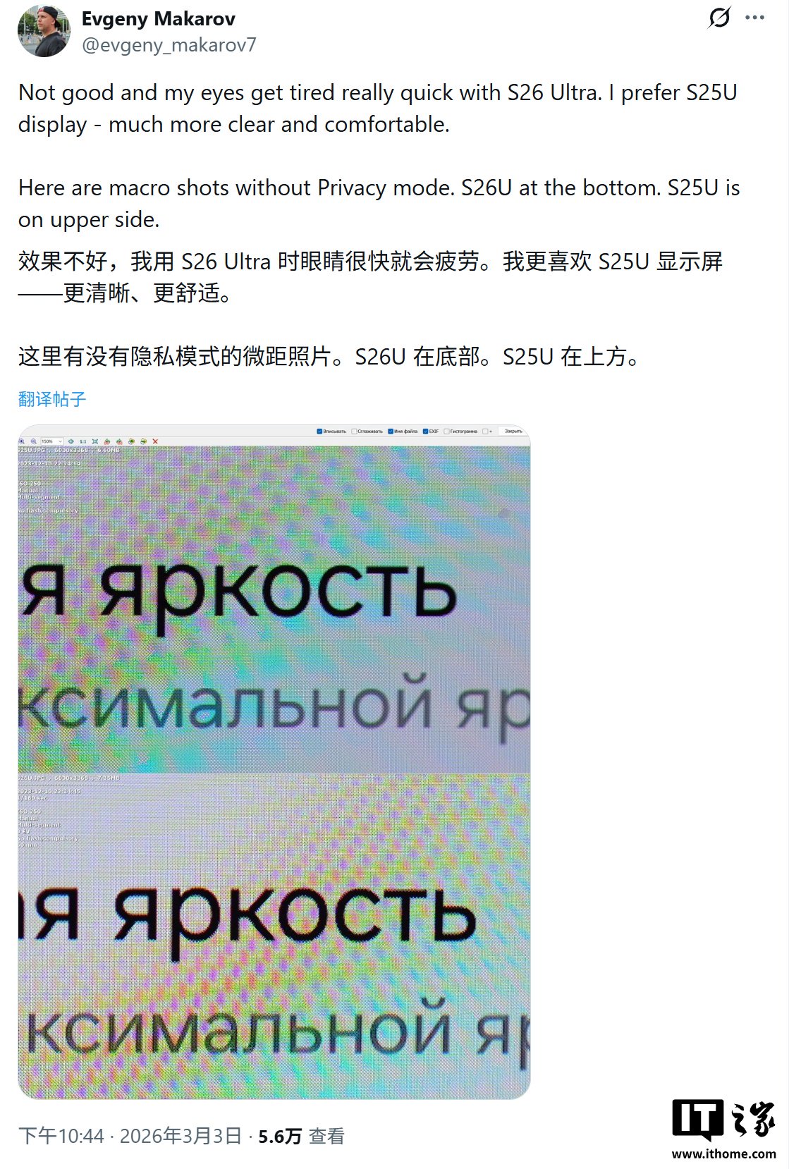 根据 Evgeny Makarov 在 X 平台分享了一张特写照片,三星 Galaxy S26 Ultra 显示的黑色文字边缘明显粗糙,并认为会加速用眼疲劳,而 Galaxy S25 Ultra 显示效果更清晰、更舒适,灰色调更为一致。