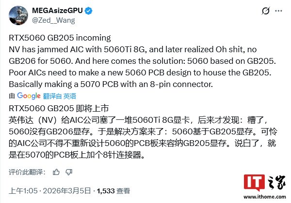 IT之家 3 月 5 日消息,英伟达现有的 GeForce RTX 5060 桌面端显卡基于 GB206 GPU,启用了该核心全部 36 组 SM 中的 30 组。而消息人士 MEGAsizeGPU (@Zed__Wang) 今晨表示,英伟达还将推出基于 GB205 核心的新版 RTX 5060。