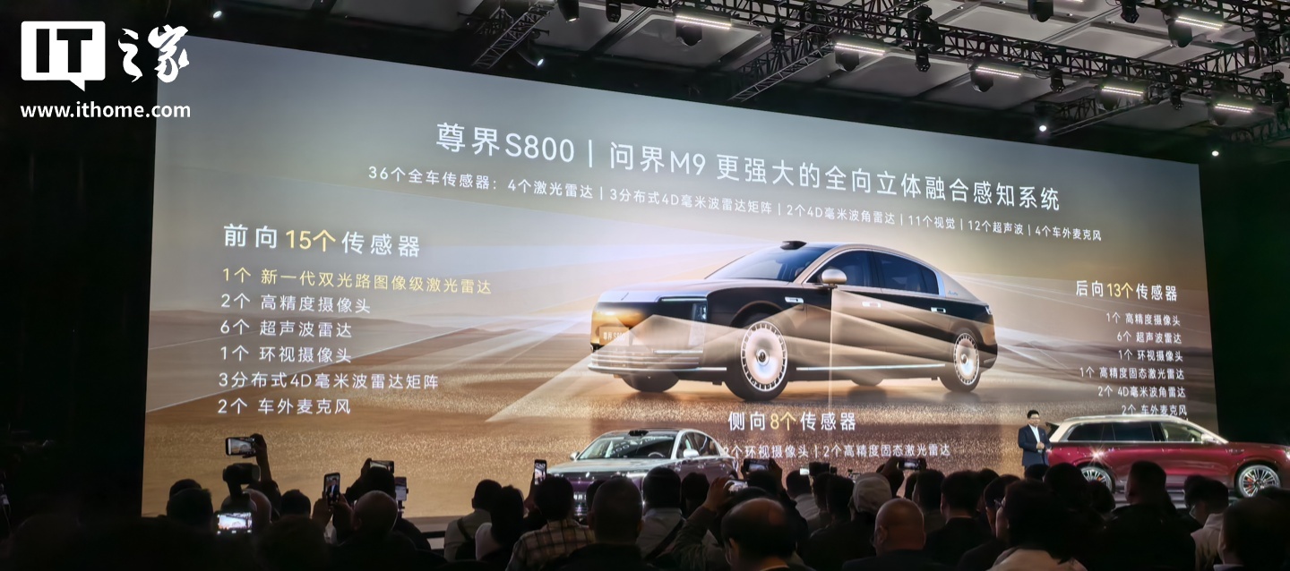 据介绍,尊界 S800 将拥有更强大的全向立体融合感知系统:全车 36 个传感器,包括 4 个激光雷达、3 分布式 4D 毫米波雷达矩阵、2 个 4D 毫米波角雷达、11 个视觉、12 个超声波、4 个车外麦克风。