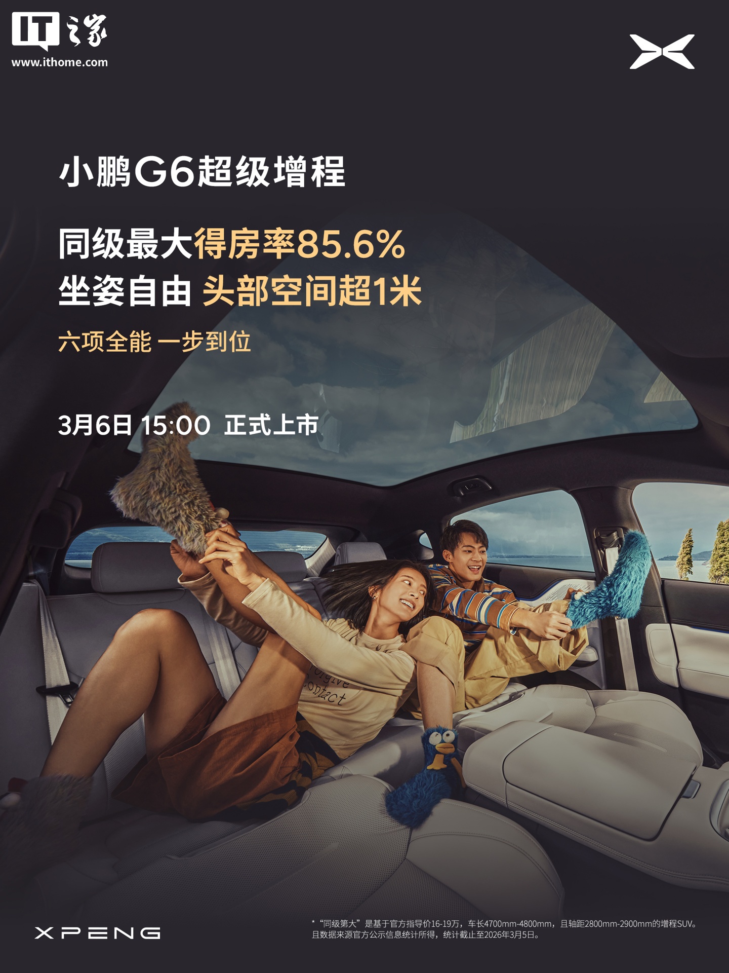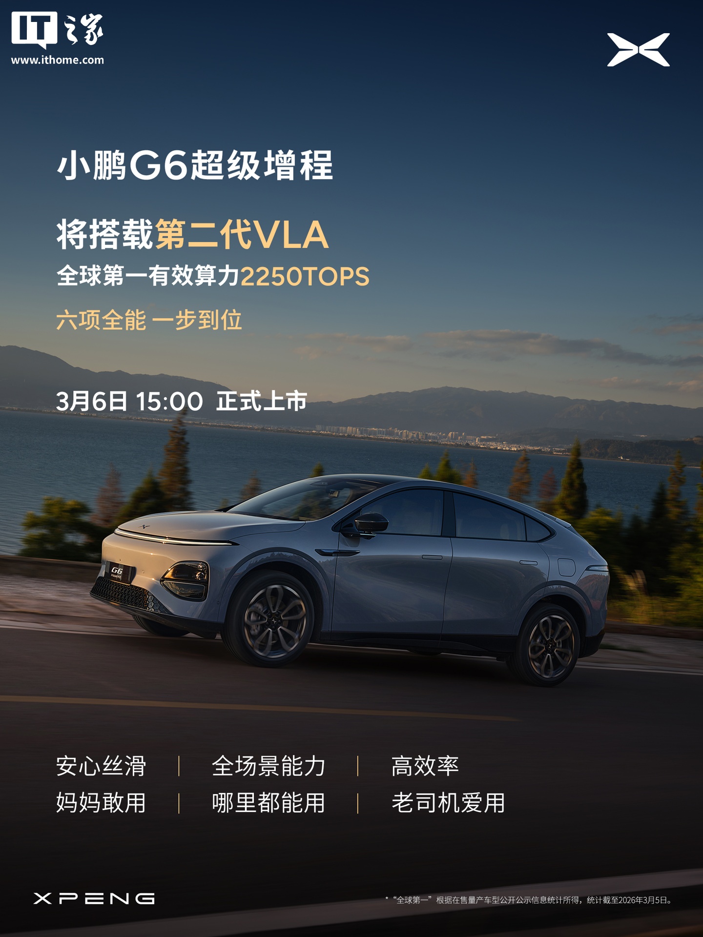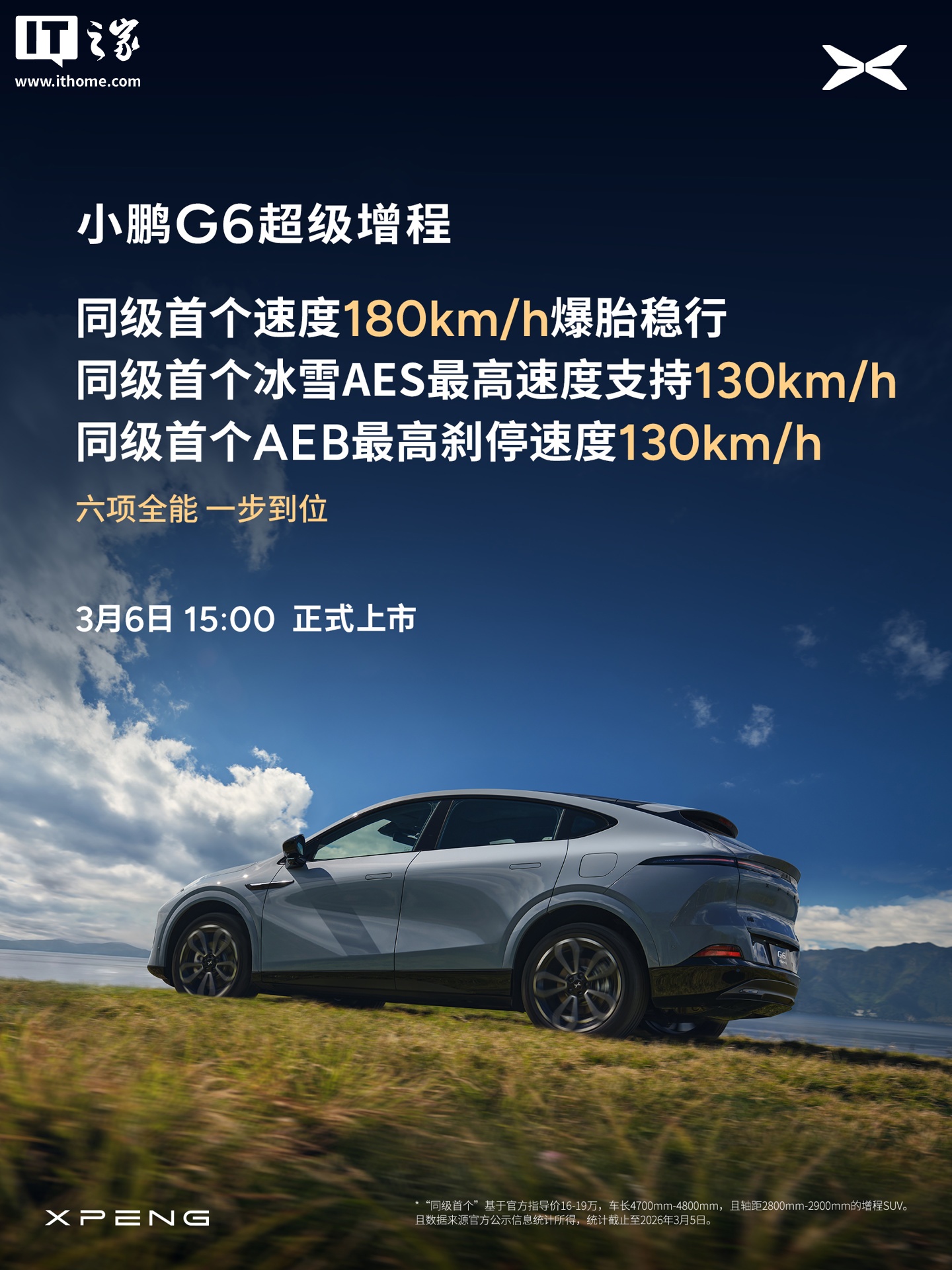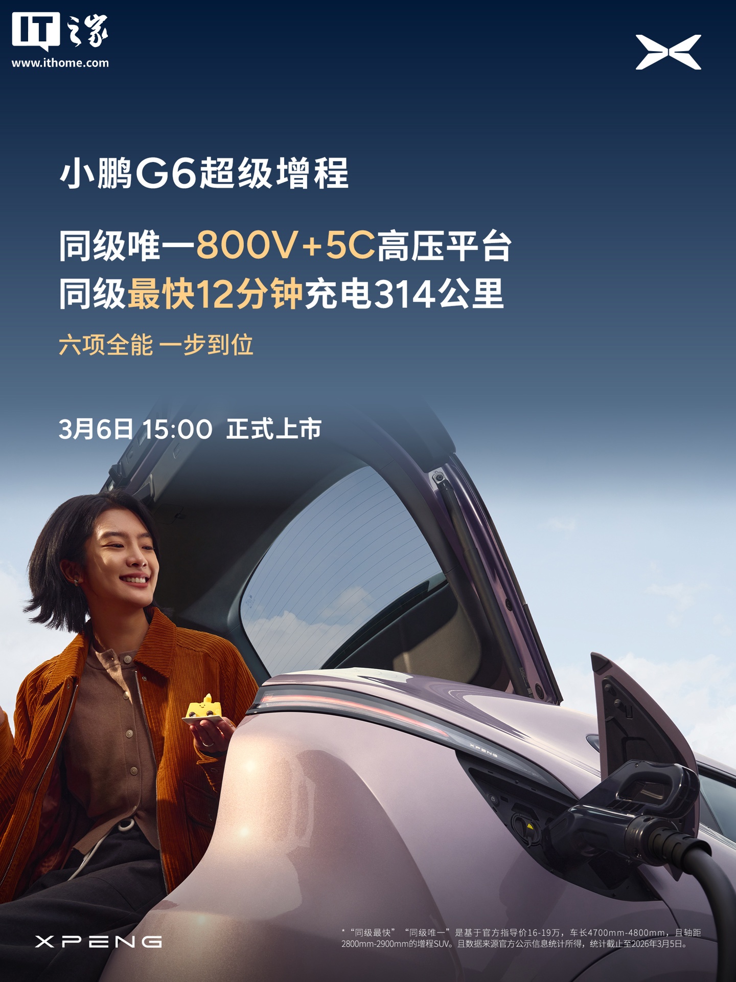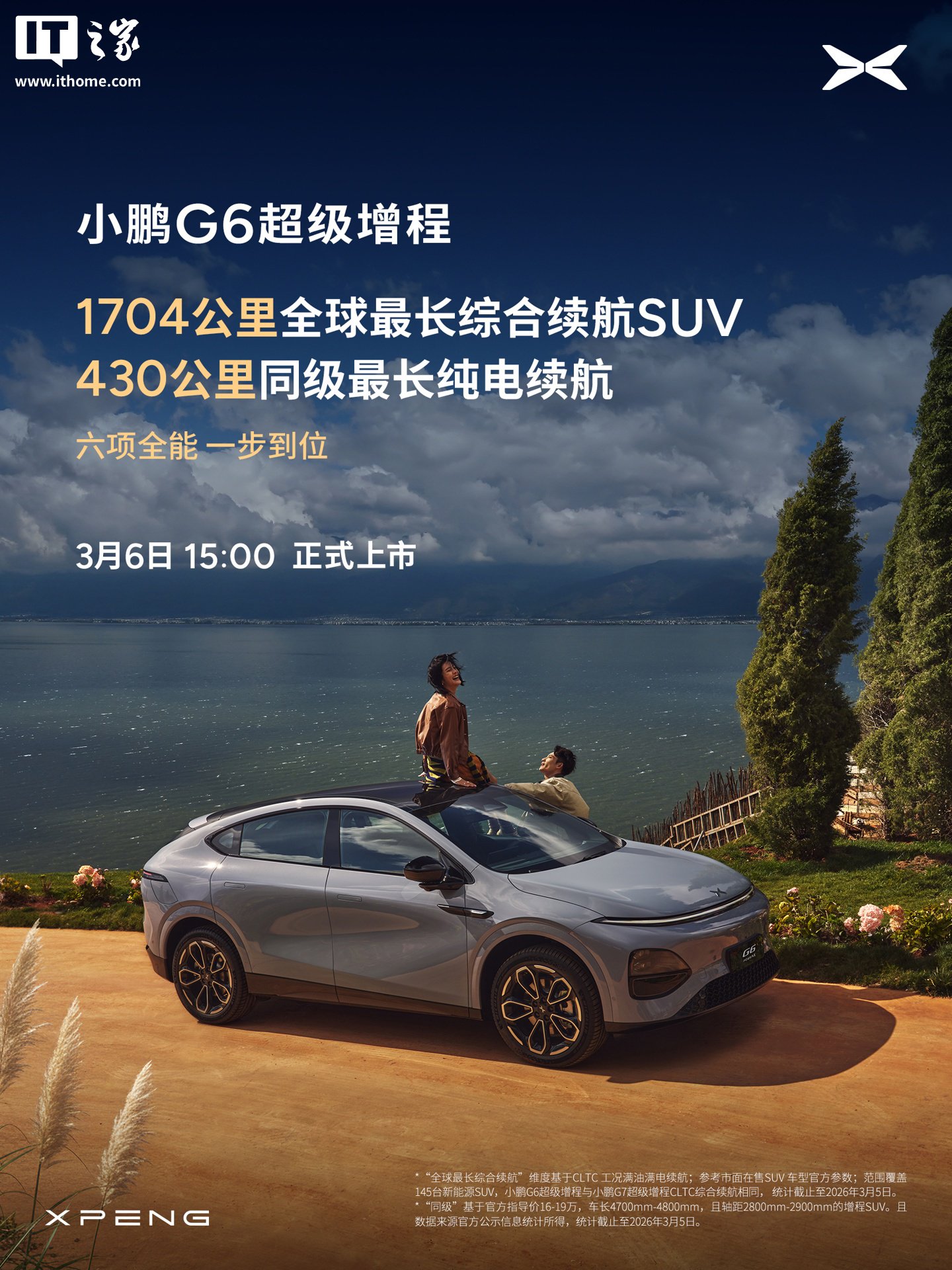 IT之家 3 月 5 日消息,小鹏汽车官方今日宣布,小鹏 G6 超级增程轿跑 SUV 将在 3 月 6 日 15:00 上市,宣称“六项全能 一步到位”。