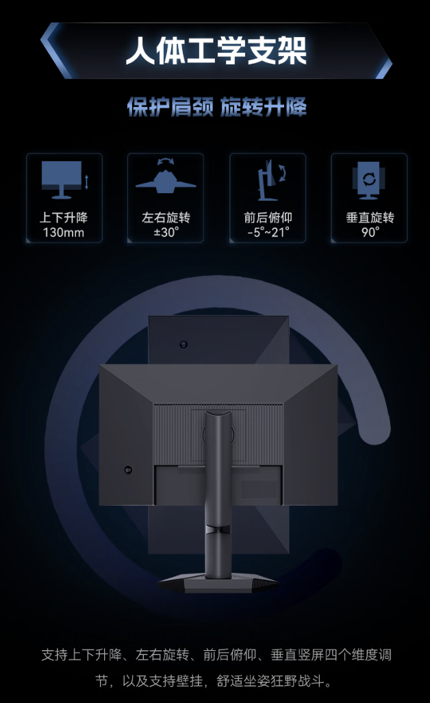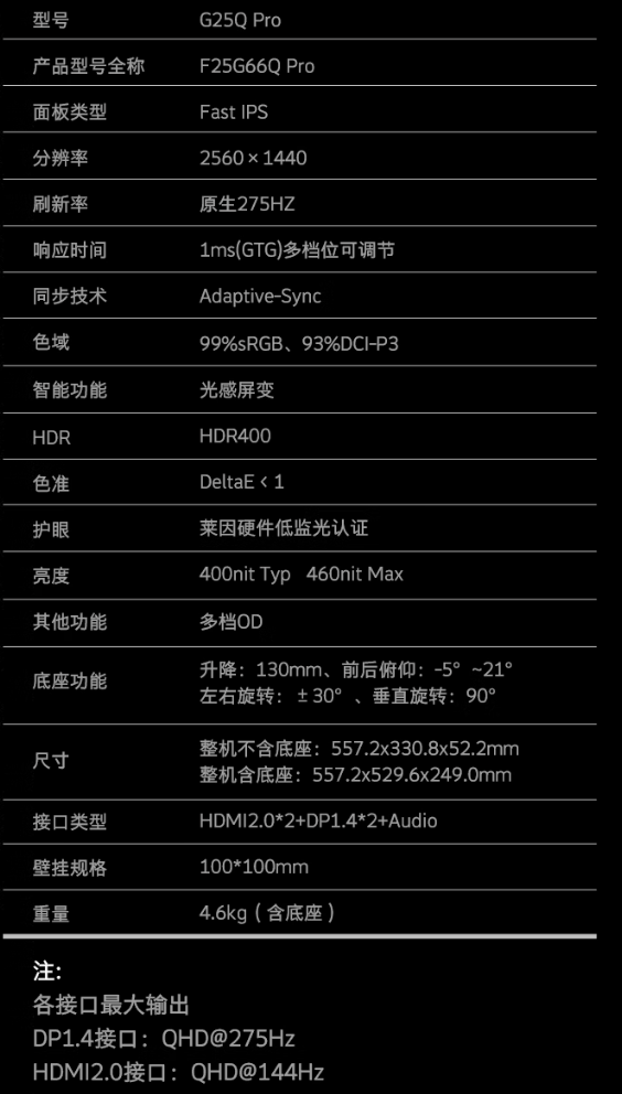 该机支架支持升降 / 俯仰 / 旋转(支架支持快拆),显示器本体支持 VESA 100x100mm 壁挂,提供 2 个 HDMI 2.0(144Hz)、2 个 DP 1.4(275Hz),1 个 3.5mm 音频接口。
