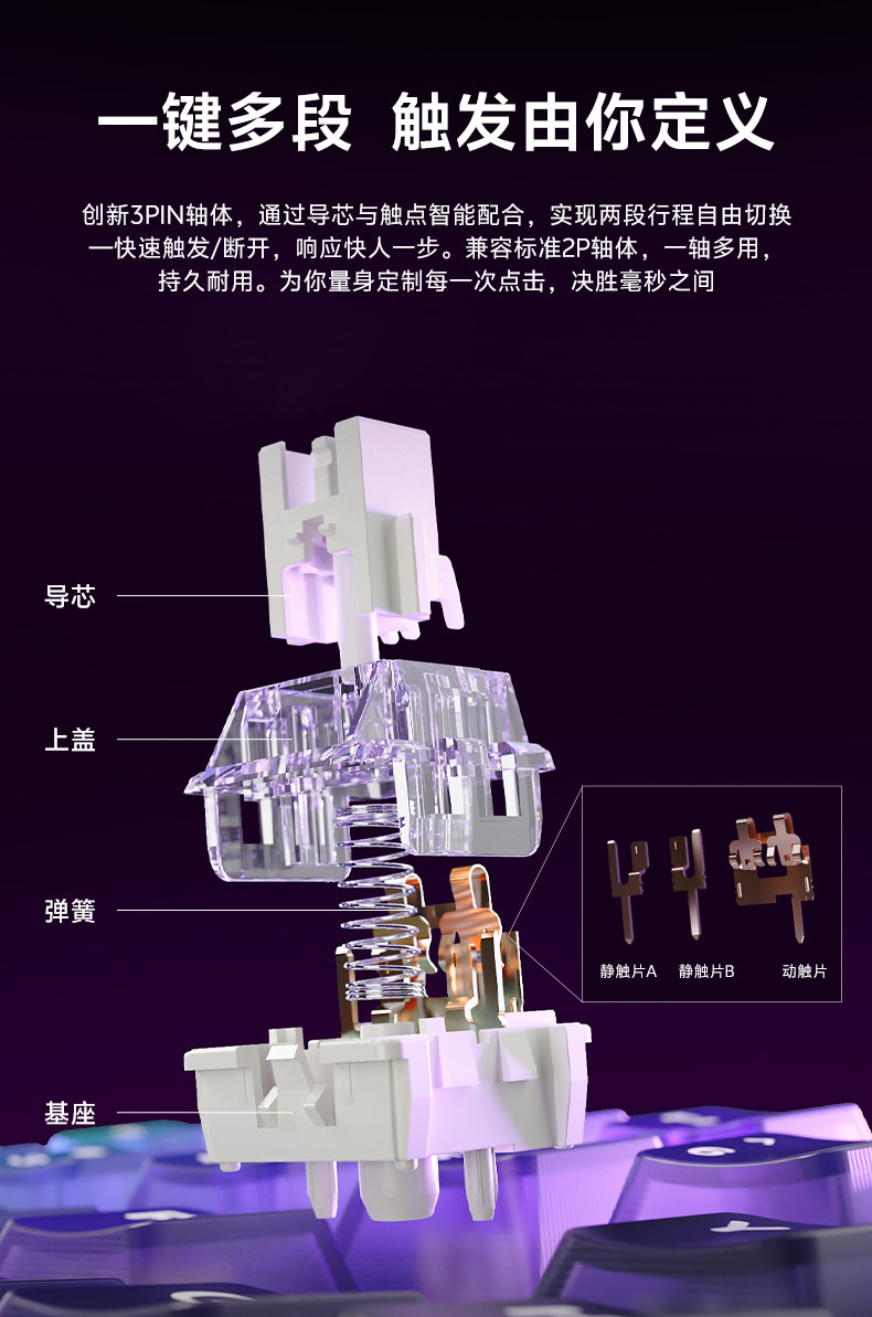 该特别款键盘搭载机械 RT 轴体。该开关采用双静触片 + 单动触片设计,可通过导芯与触点智能配合实现两段行程自由切换、快速触发 / 断开,同时仍支持单行程操作,还能实现段落手感的多样化。这款键盘的热插拔 PCB 也兼容标准的 2-Pin 机械轴体。