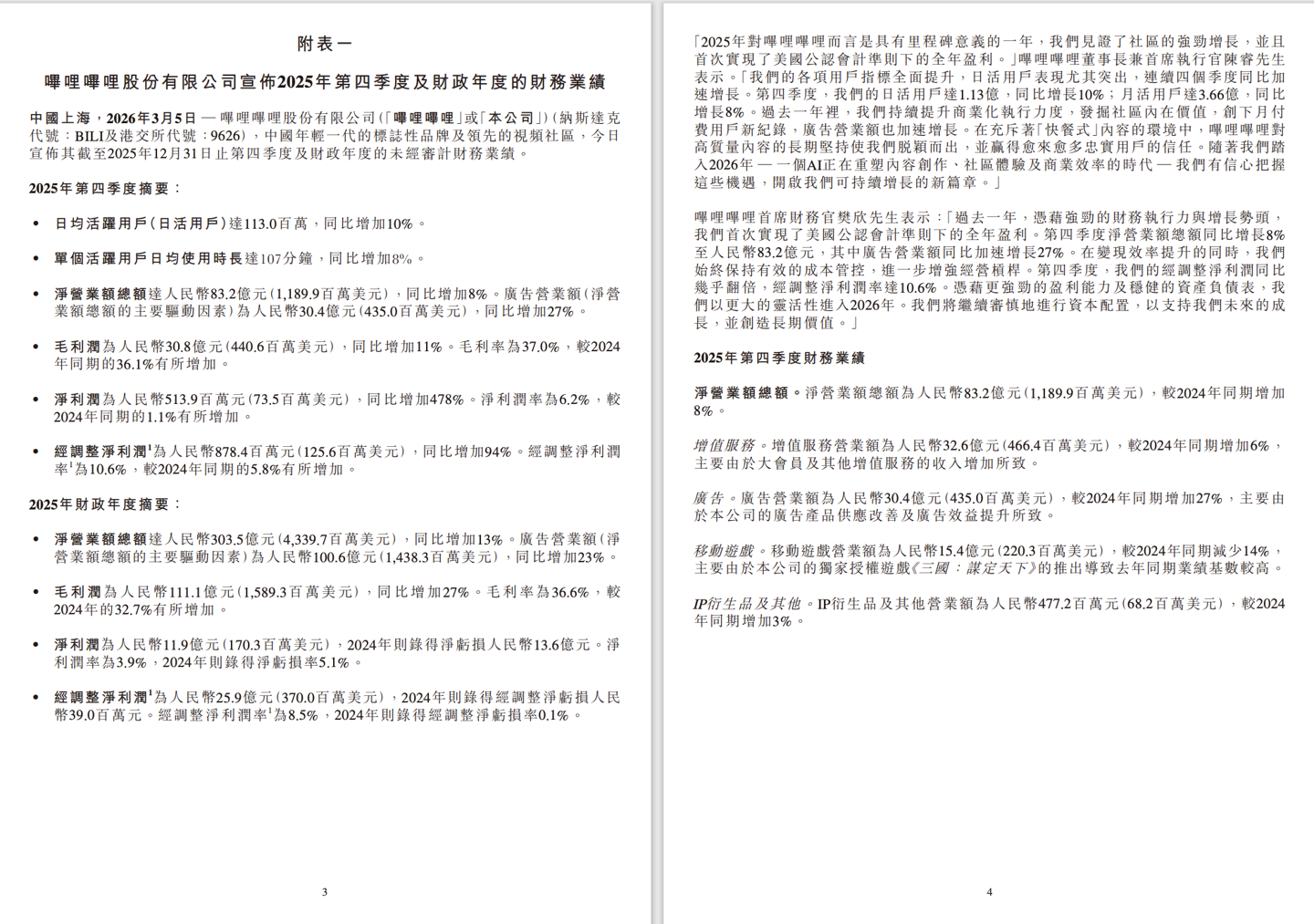 B站董事长陈睿表示:“2025 年对哔哩哔哩而言是具有里程碑意义的一年,我们见证了社区的强劲增长,并且首次实现了美国公认会计准则下的全年盈利。我们的各项用户指标全面提升,日活用户表现尤其突出,连续四个季度同比加速增长。第四季度,我们的日活用户达 1.13 亿,同比增长 10%;月活用户达 3.66 亿,同比增长 8%。过去一年里,我们持续提升商业化执行力度,发掘社区内在价值,创下月付费用户新纪录,广告营业额也加速增长。在充斥着‘快餐式’内容的环境中,哔哩哔哩对高质量内容的长期坚持使我们脱颖而出,并赢得愈来愈多忠实用户的信任。随着我们踏入 2026 年 —— 一个 AI 正在重塑内容创作、社区体验及商业效率的时代 — 我们有信心把握这些机遇,开启我们可持续增长的新篇章。”