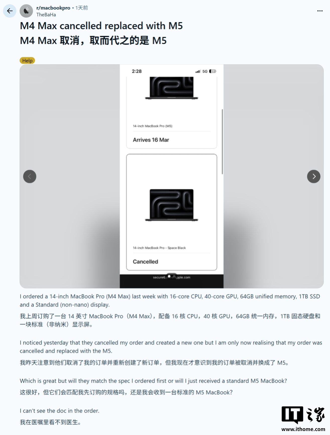 包括 u/TheBaHa、u/o2b 在内的多位用户在 Reddit 社区分享换机经历,在苹果发布 2026 款 M5 系列 MacBook 之前,他们订购了旧款 M4 系列机型,但苹果随后主动取消旧款订单,并免费升档为 M5 系列机型。