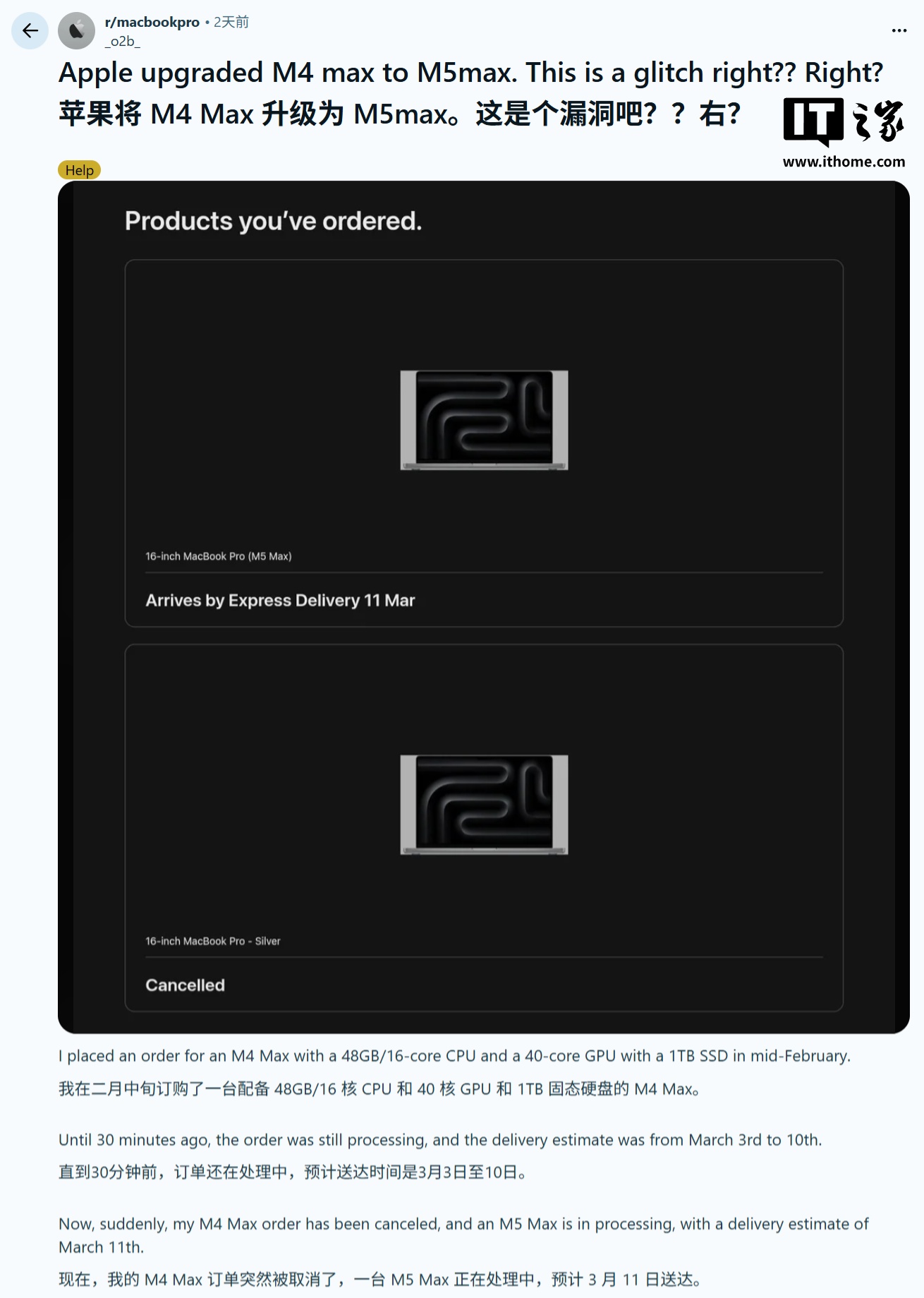 系统随后自动取消了该订单,并在保持原价不变的情况下,将发货清单更新为 M5 Max 版本,交货时间仅微调至 3 月中旬。此外,购买 M4 版 MacBook Air 的用户也获得了同等待遇,直接升级为 M5 版本。