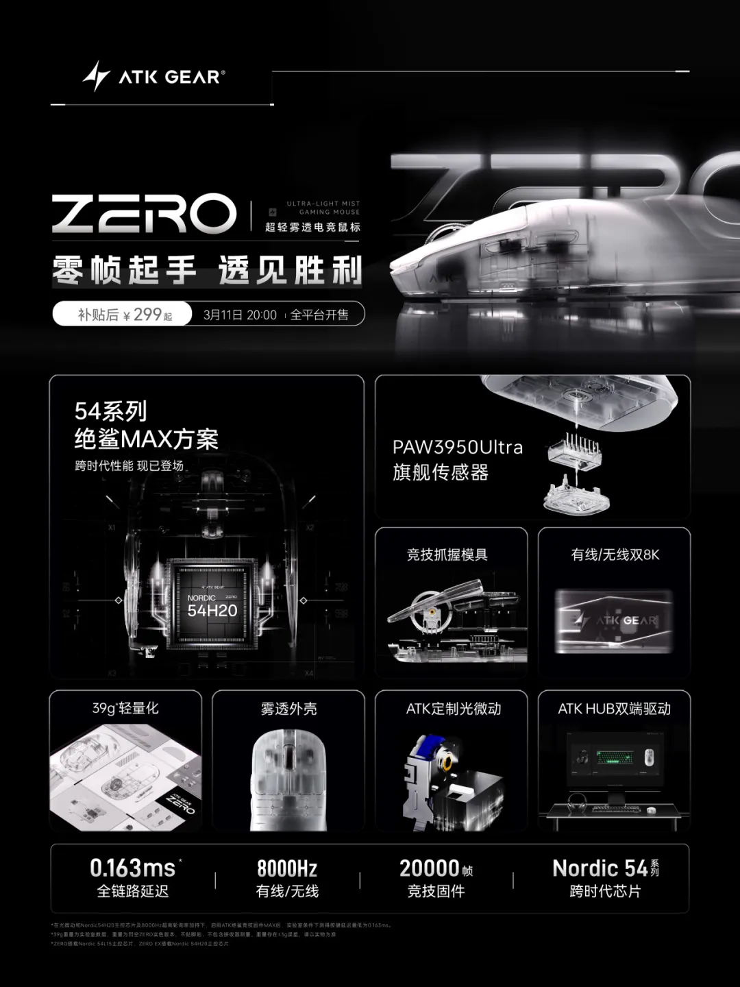 IT之家从商品页面获悉,这款鼠标采用了 39g 轻量化设计,适配不同握姿;采用 ATK 自研 54 系列绝鲨 MAX 鼠标方案,搭载 PAW 3950 Ultra 旗舰传感器 + Nordic 54 H20 主控,按键延迟 0.163ms,轮询率 8000Hz,续航时长 500 小时;支持网页、客户端双端驱动。