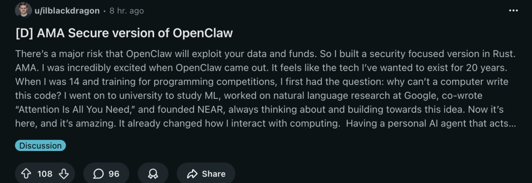 然而开发者社区还是不放心,毕竟 OpenClaw 有 2000 多个公开实例被攻击,以及存在大量恶意技能,IronClaw 一旦走红会不会重蹈覆辙?
