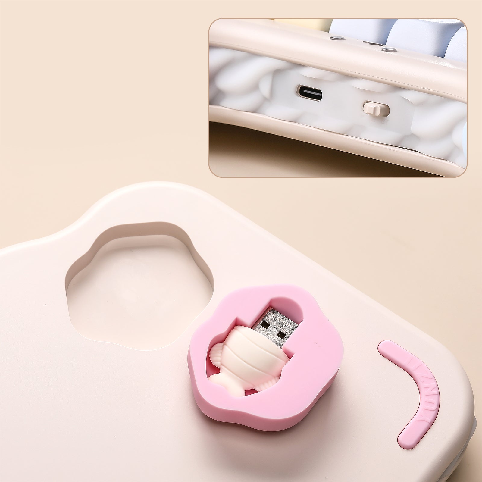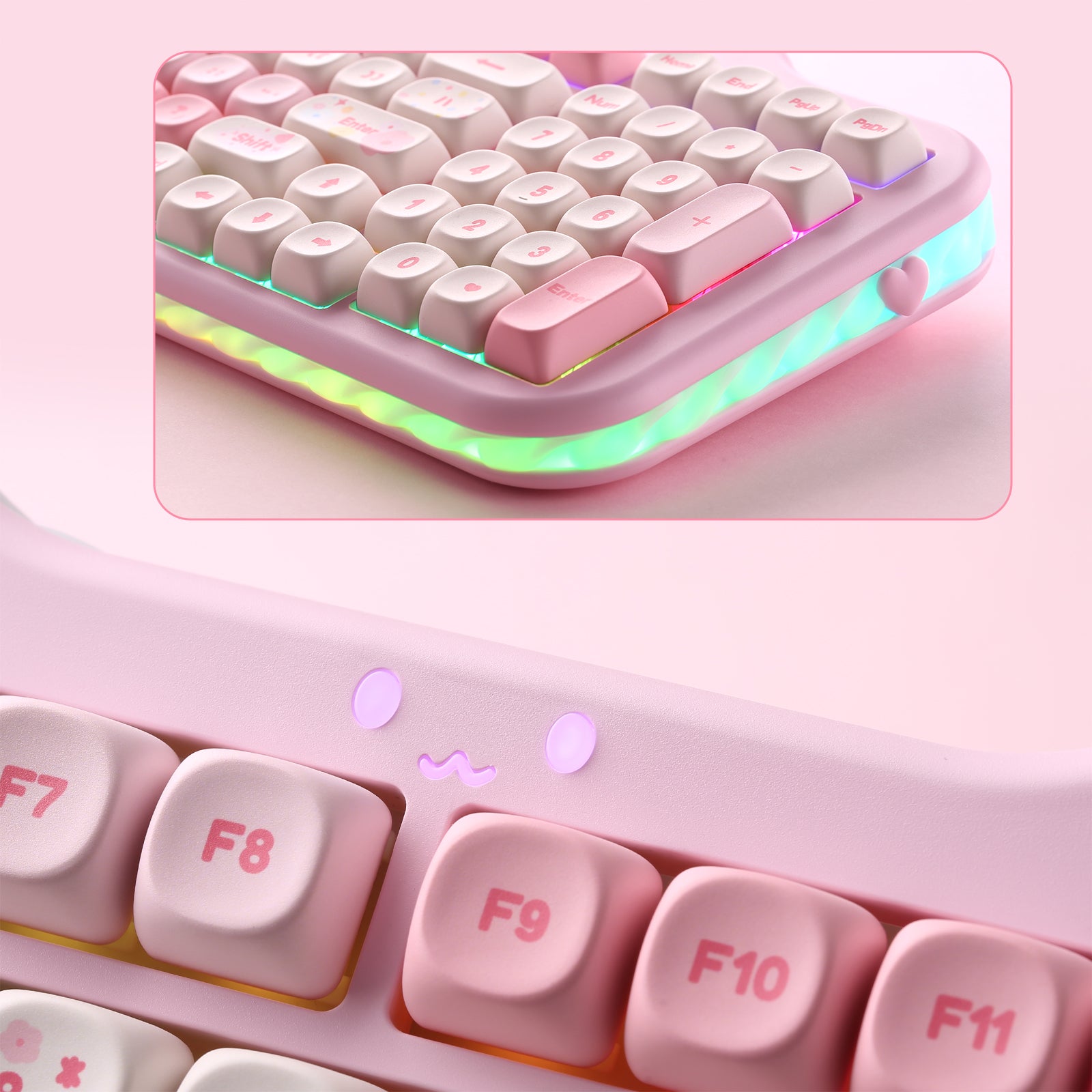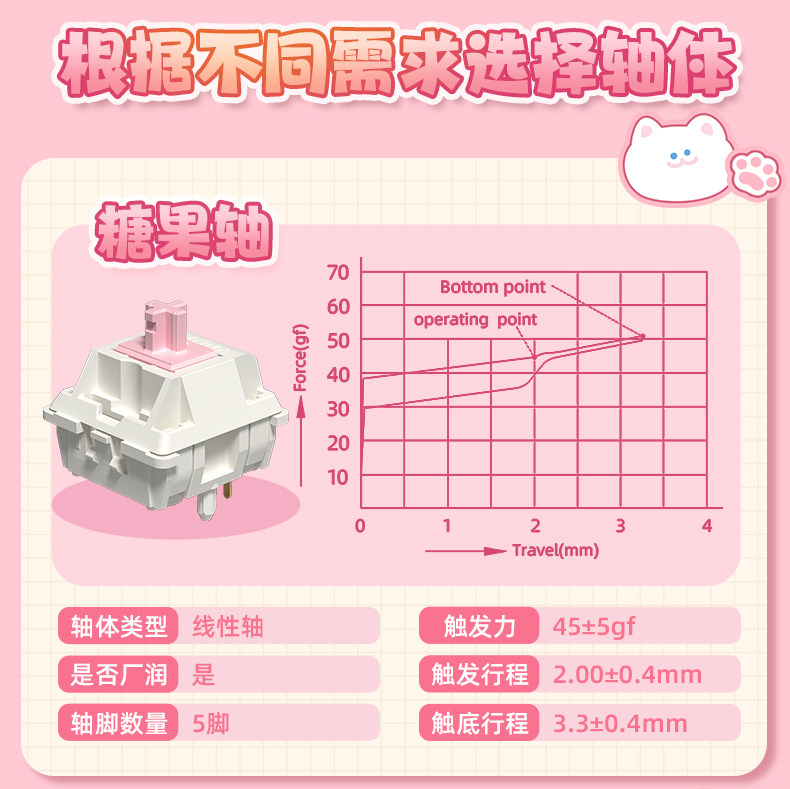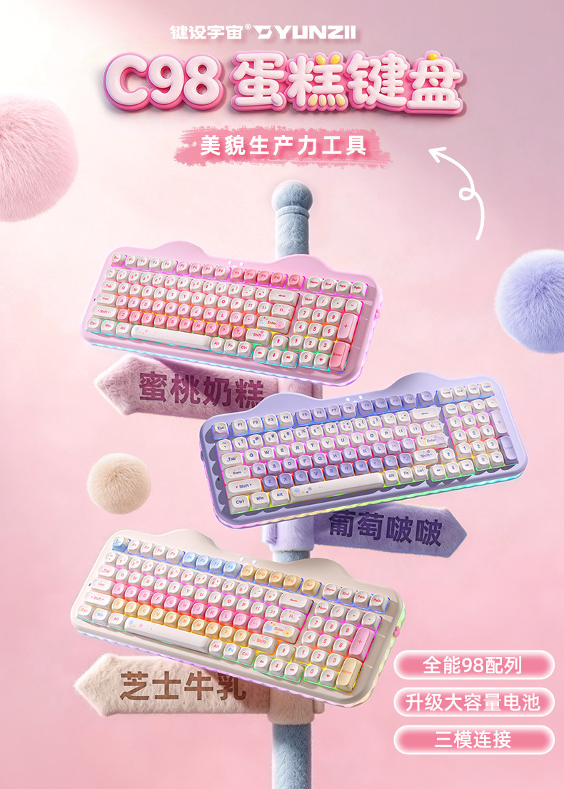 YUNZII C98 综合了猫猫笑脸状态指示灯、蛋糕夹层硅胶侧裙、猫爪脚撑、小鱼外形 2.4GHz 接收器等萌系设计元素,倍显可爱风格。