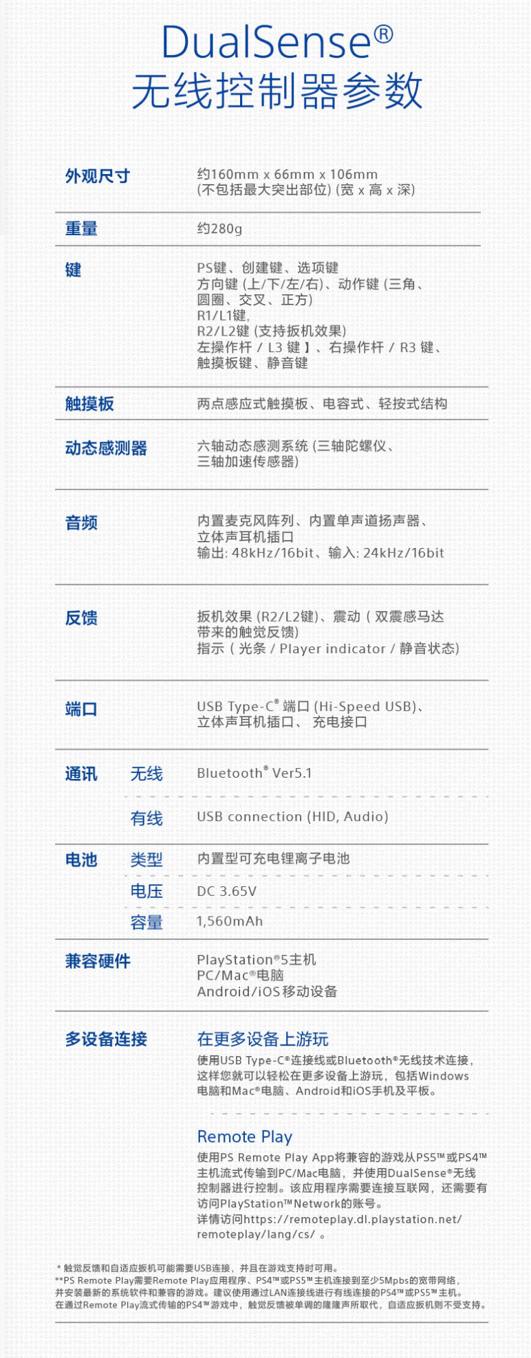 规格方面,这款限定版手柄与标准版 DualSense 手柄一致,整体重量约 280 克,尺寸约 160x66x106mm,采用蓝牙 5.1 技术,内置 1560 毫安时电池。
