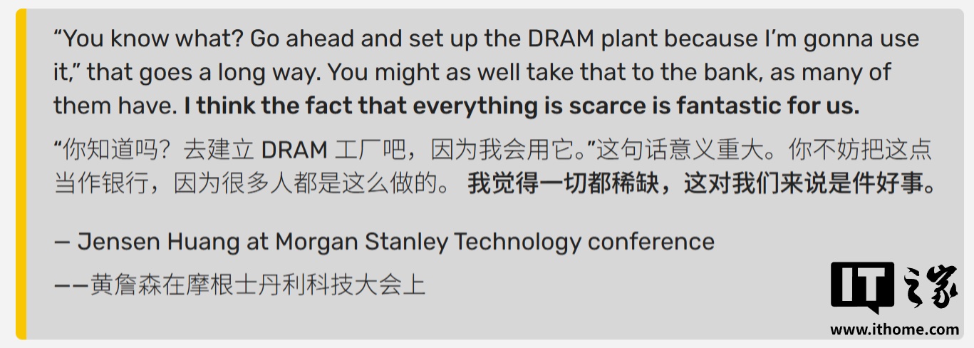 IT之家 3 月 7 日消息,科技媒体 PCWORLD 昨日(3 月 6 日)发布博文,报道称在摩根士丹利科技大会上,英伟达首席执行官黄仁勋表示,当前内存供应稀缺,对英伟达来说是“极好的消息”(fantastic for us)。