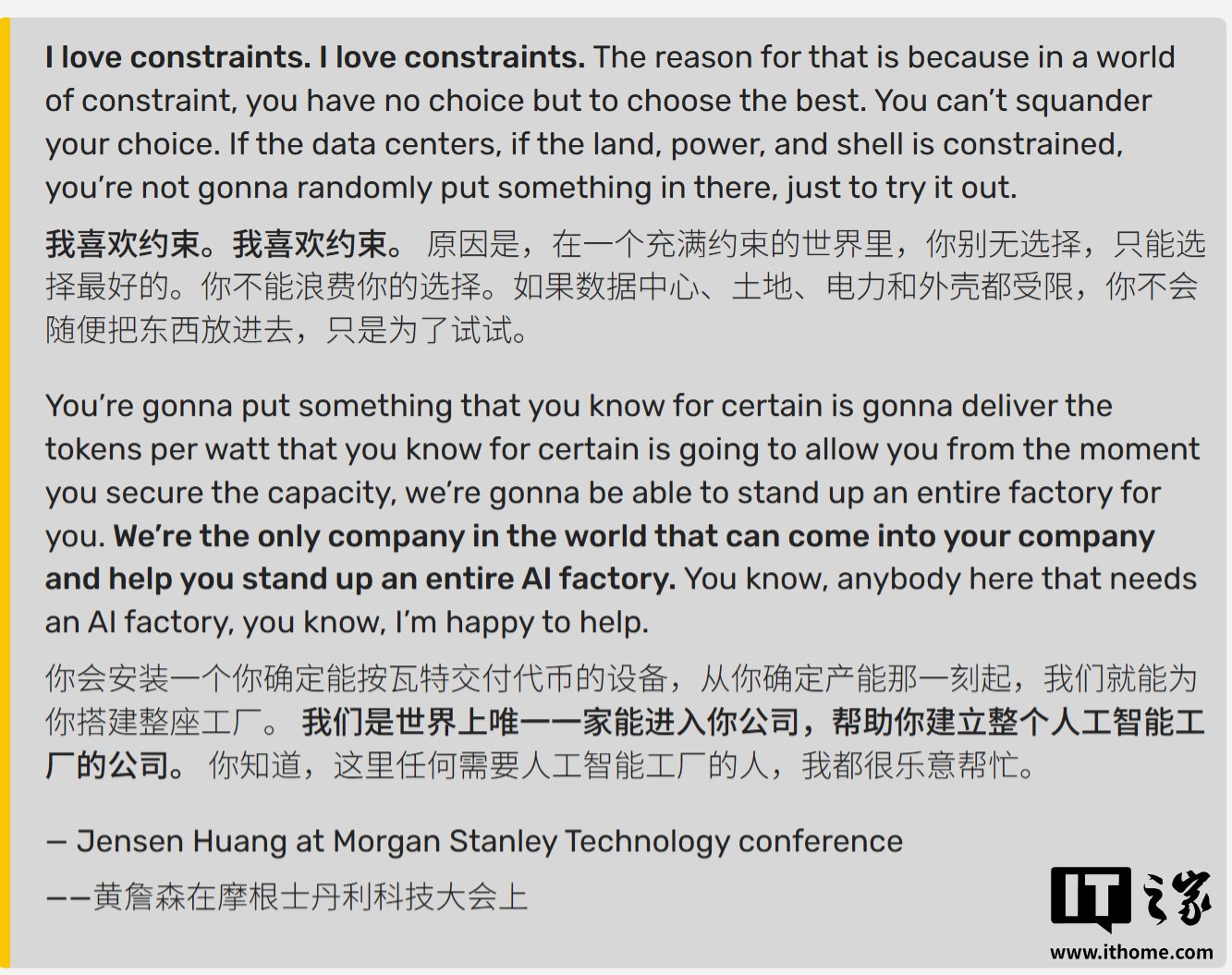 为了进一步解释这种逻辑,黄仁勋强调自己“热爱限制”。他解释道,在资源受限的环境下,客户面对极其有限的数据中心空间和电力供应,绝不会随意购买设备乱试,而是必须精准选择能稳定提供最高“每瓦 Token 产出率”的硬件。IT之家附上相关截图如下:
