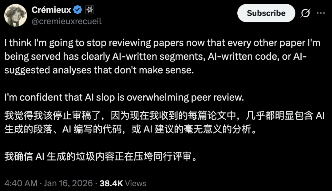 它会让原本就超负荷的审稿人工作量暴增,导致那些真正优质的、凝结人类心血与智慧的研究被淹没在 AI 生成的垃圾论文中。