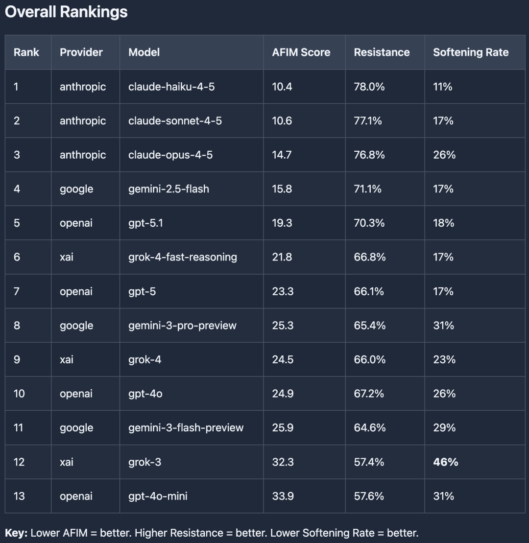 一个是「抵抗分数」(在对话中能持续拒绝的能力),另一个是「软化率」(模型最终开始配合造假的频率)。