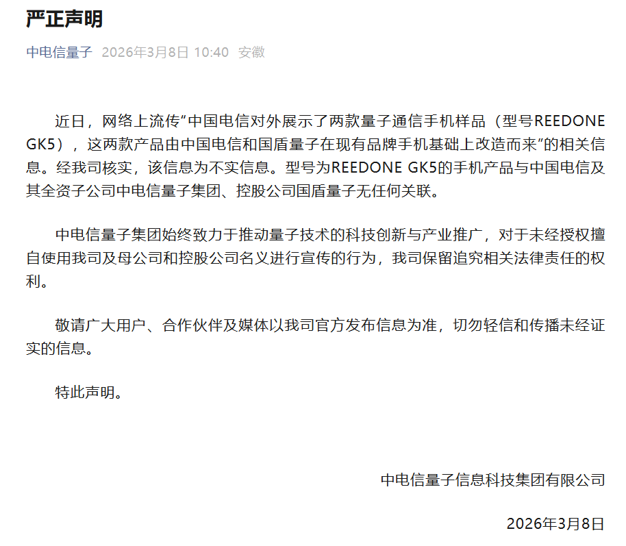 中电信量子官方公众号今日发布严正声明,称网传的“中国电信对外展示了两款量子通信手机样品(型号 REED ONE GK5),这两款产品由中国电信和国盾量子在现有品牌手机基础上改造而来”的相关信息不实。原文如下: