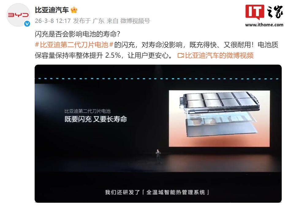 IT之家注意到,比亚迪汽车今日再度谈及了“闪充是否会影响电池的寿命”这一话题。官方表示,比亚迪第二代刀片电池的闪充,对寿命没影响,既充得快、又很耐用。同时,电池质保容量保持率整体还提升 2.5%。