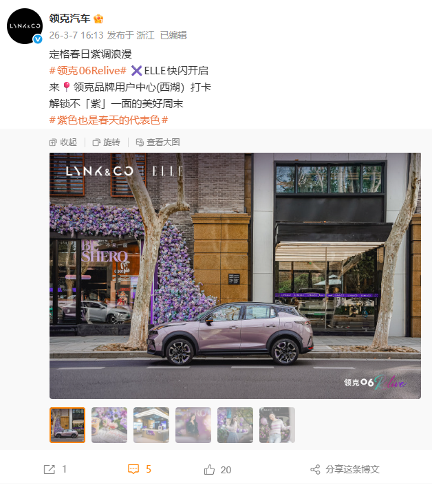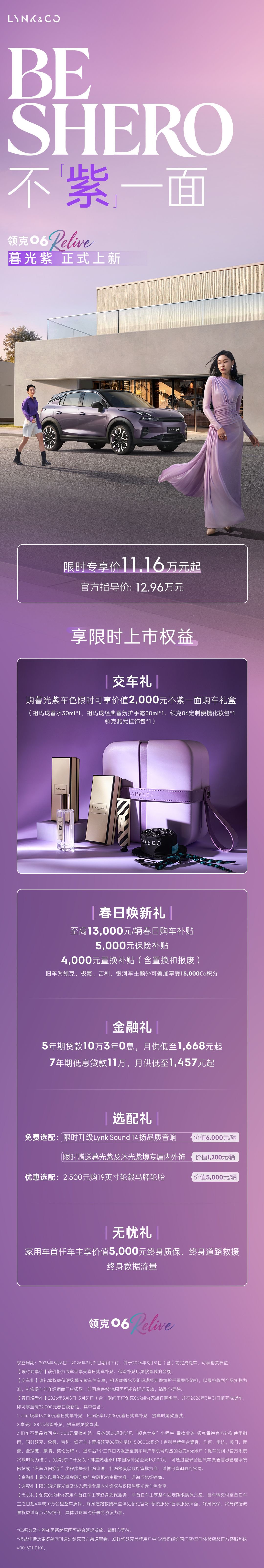 IT之家 3 月 8 日消息,领克汽车今日宣布,领克 06 Relive 暮光紫新色车型上市,官方指导价 12.96 万元,限时专享价 11.16 万元起,限时至高享 22000 元春日焕新礼。