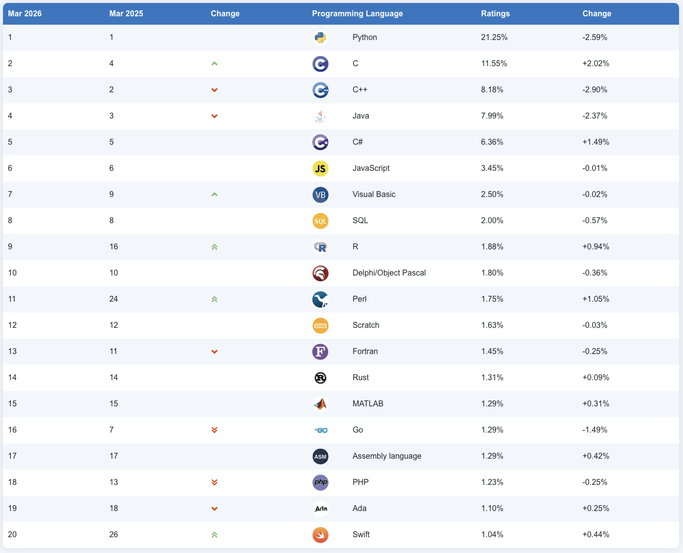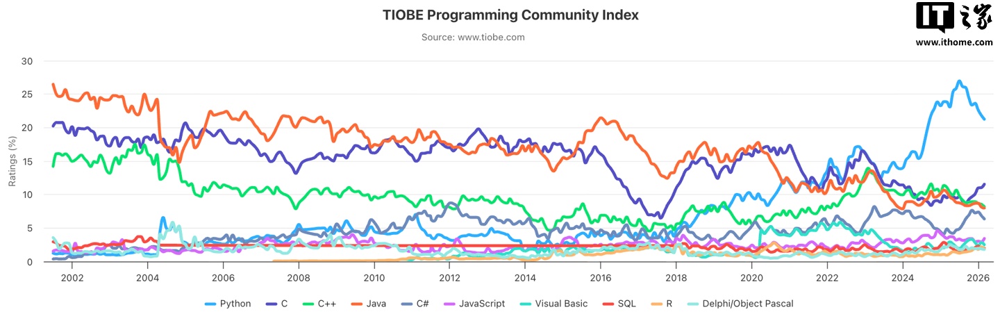 IT之家 3 月 9 日消息,TIOBE 编程社区指数是一个衡量编程语言受欢迎程度的指标,评判的依据来自世界范围内的工程师、课程、供应商及搜索引擎,目前 TIOBE 官网公布了 2026 年 3 月的编程语言排行榜,IT之家整理如下: